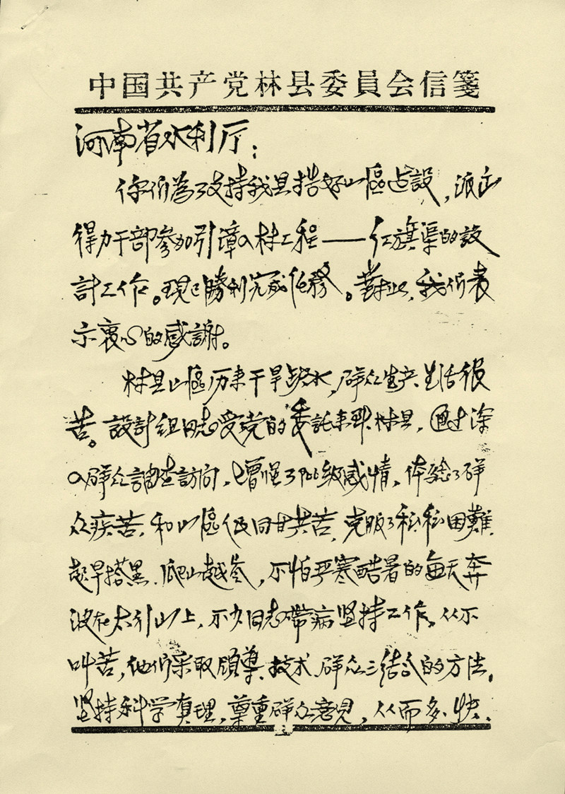 舉世聞名的人工天河——紅旗渠,原為林縣自辦工程,1960年因國(guó)家自然災(zāi)害而停工。省水利廳設(shè)計(jì)院受水利廳委托成立紅旗渠設(shè)計(jì)組,經(jīng)過(guò)三年的艱苦奮斗和科學(xué)設(shè)計(jì),使紅旗渠建設(shè)列入國(guó)家基本建設(shè)項(xiàng)目。老一輩豫水設(shè)計(jì)人為紅旗渠的順利實(shí)施提供了有力的技術(shù)支撐,受到了省水利廳的嘉獎(jiǎng)和林縣政府的書面表?yè)P(yáng)。工程設(shè)計(jì)流量23m3/s,設(shè)計(jì)灌溉面積54萬(wàn)畝。
