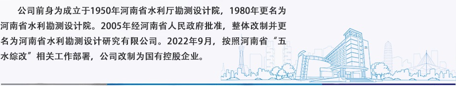 公司前身可追溯至1950年成立的河南省治淮總指揮部計(jì)劃處,1956年與河南省水利廳勘測設(shè)計(jì)處合并成立了河南省水利廳勘測設(shè)計(jì)院,1980年更名為河南省水利勘測設(shè)計(jì)院。2005年經(jīng)省人民政府批準(zhǔn),整體改制為科技型企業(yè),并更名河南省水利勘測設(shè)計(jì)研究有限公司。2022年9月,根據(jù)河南省委、省人民政府“五水綜改”相關(guān)工作部署,公司積極推進(jìn)股權(quán)重組,由河南水利投資集團(tuán)有限公司控股51%,公司改制為國有控股企業(yè)。