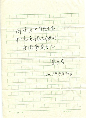 李文清同志,女,1929年5月出生,1952年參加工作以來(lái),不論在什么工作單位和工作崗位,始終勤勤懇懇。任勞任怨,干一行愛(ài)一行,干好一行,多次被評(píng)為先進(jìn)工作者。 1980年8月到河南省水利勘測(cè)設(shè)計(jì)院任會(huì)計(jì),她認(rèn)真負(fù)責(zé),待人熱情,服務(wù)周到,受到同事的好評(píng)。她積極要求進(jìn)步,1956年就向黨組織遞交了入黨申請(qǐng)書(shū),幾十年矢志不渝,1990年12月退休后,她堅(jiān)持理想信念,孜孜不倦的追求,于1995年3月光榮入黨。入黨后,她始終在政治上同黨中央保持高度一致,堅(jiān)信只有中國(guó)共產(chǎn)黨才能帶領(lǐng)全國(guó)各族人民走中國(guó)特色社會(huì)主義道路,實(shí)現(xiàn)全面小康和國(guó)家富強(qiáng)。她關(guān)心國(guó)家大事,關(guān)心單位發(fā)展,深感為黨工作太少,為了表達(dá)對(duì)黨的深厚感情,2011年“七一”前夕,為慶祝建黨90周年,一次性向組織交納黨費(fèi)9999元;2016年6月16日,她用樸實(shí)無(wú)華的語(yǔ)言給黨組織寫(xiě)了“我要給偉大的中國(guó)共產(chǎn)黨過(guò)生日”,向組織繳納黨費(fèi)2000元;2017年9月22日,在黨的十九大即將召開(kāi)之際,88歲高齡的她平時(shí)省吃儉用,又一次從每月3000多元的退休金里積攢了10000元作為特殊黨費(fèi),向黨的十九大獻(xiàn)上自己的一份厚禮,祝賀黨的十九大勝利召開(kāi),祝愿我們的黨在以習(xí)近平同志為核心的黨中央集體領(lǐng)導(dǎo)下,實(shí)現(xiàn)兩個(gè)一百年的宏偉目標(biāo),實(shí)現(xiàn)偉大的中國(guó)夢(mèng)。