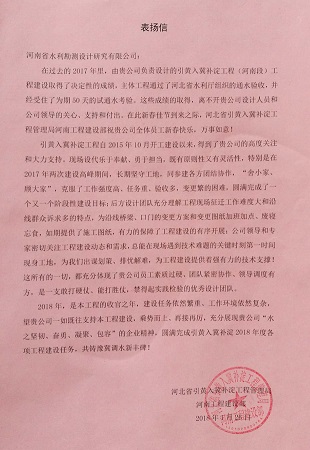 1月29日上午,引黃入冀補(bǔ)淀工程建管局河南工程建設(shè)部發(fā)來表揚(yáng)信,對(duì)我公司在工程建設(shè)期間的貢獻(xiàn)表示感謝,并對(duì)設(shè)代人員的工作給予了高度肯定。