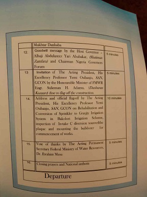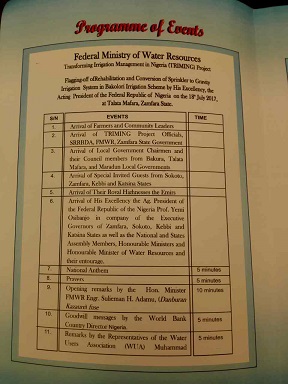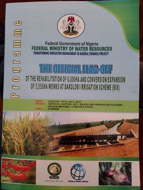 2017年7月18日,由尼日利亞聯(lián)邦政府向世界銀行貸款的Bakolori灌區(qū)項(xiàng)目開工典禮在工程現(xiàn)場(chǎng)隆重舉行。該項(xiàng)目受到了尼日利亞政府的高度重視,多位政要和當(dāng)?shù)赝镣跚蹰L受邀參加典禮儀式。按照典禮議程,尼日利亞目前最高掌權(quán)人代總統(tǒng)Prof. Yemi Osibanjo出席開工典禮,講話并親自為工程開工剪彩,由于突發(fā)的暴雨天氣,代總統(tǒng)未能按照既定的時(shí)間到達(dá)現(xiàn)場(chǎng)。最后,由尼日利亞聯(lián)邦水資源部部長Engr. Suleiman Hussein Adamu主持典禮,并對(duì)該項(xiàng)目進(jìn)行了開工儀式剪彩,世行官員、當(dāng)?shù)卣?dāng)?shù)厍蹰L、農(nóng)民代表、咨詢方、承包商等參加了項(xiàng)目開工典禮。