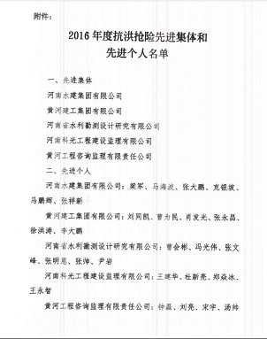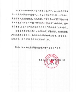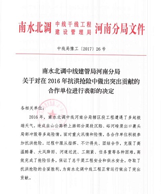 3月15日,南水北調(diào)中線干線工程建設(shè)管理局河南分局對(duì)在2016年抗洪搶險(xiǎn)中做出突出貢獻(xiàn)的合作單位進(jìn)行了表彰。我公司榮獲“2016年度抗洪搶險(xiǎn)先進(jìn)集體”稱(chēng)號(hào),曹會(huì)彬、馮光偉等6位同志獲得“2016年度抗洪搶險(xiǎn)先進(jìn)個(gè)人”稱(chēng)號(hào)。表彰文件如下: