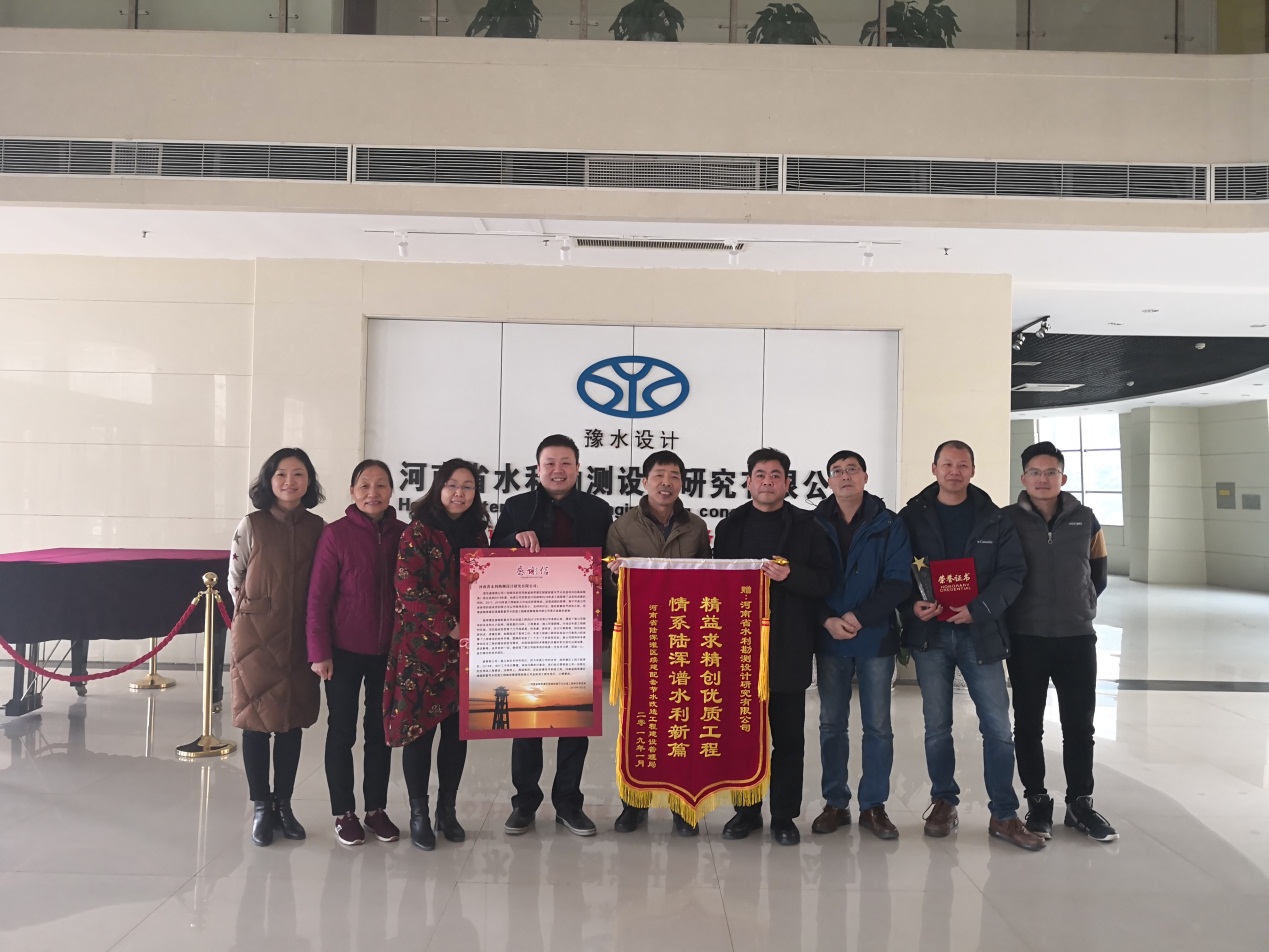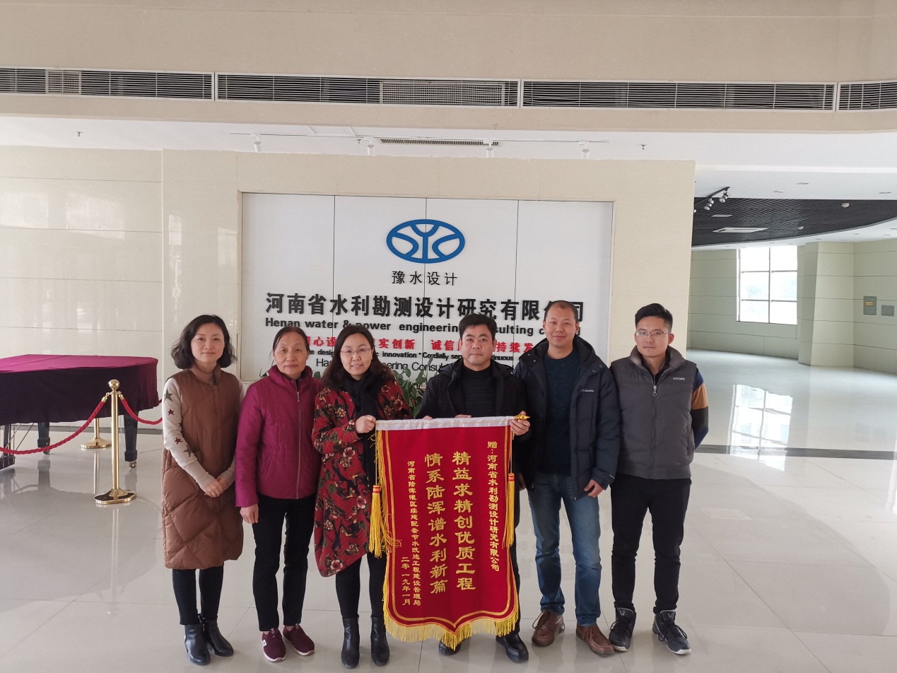 2019年1月8日,河南省陸渾灌區(qū)續(xù)建配套節(jié)水改造工程建設管理局(以下簡稱“建管局”)局長李付長、副局長段笑暉等一行人專程為我公司送來感謝信及錦旗,對公司及陸渾灌區(qū)項目組成員積極、努力、認真、負責的設計工作給予了充分的肯定:“精益求精創(chuàng)優(yōu)質工程 情系陸渾譜水利新篇”;對各參建人員在工程建設過程中提供的優(yōu)質服務表示感謝。