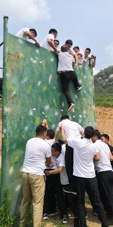 畢業(yè)墻:一面4.2米的高墻,不借助任何外界工具,在規(guī)定的時間內(nèi)全體人員完成逃生任務(wù)??此撇豢赡芡瓿傻娜蝿?wù),在教練的指導(dǎo)下大家迅速制定戰(zhàn)術(shù),通過搭建起層層人梯,人踩人、人舉人、人拉人的方式奮力拼搏,精誠合作在短短9分鐘完成了任務(wù)。當最后一位隊友在大家的努力下成功翻越畢業(yè)墻的瞬間,雀躍的歡呼聲久久不散,這是一個看似不可能完成的任務(wù),卻在團隊的共同努力下有如此震撼的結(jié)果,團隊的力量,人梯奉獻的力量,給團隊的每一位成員都帶來極大的震撼和自豪,大家忘卻肩膀血痕累累的痛楚,忘卻克服高空經(jīng)歷的恐懼,記住了被一雙雙手托舉和拉拽的安全感,記住了團隊的強大。