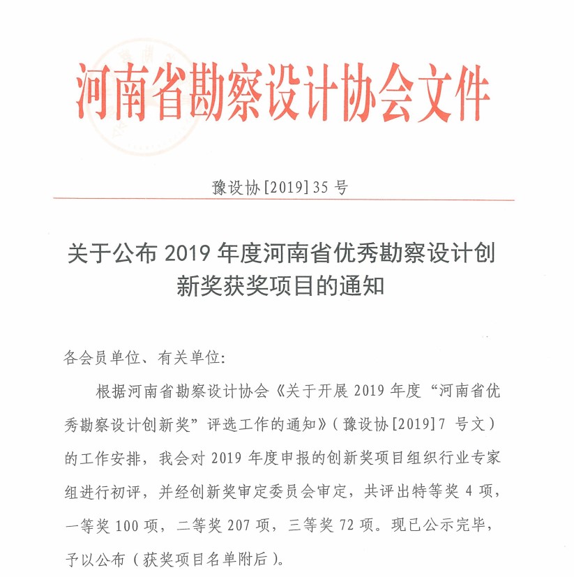 根據(jù)河南省勘察設(shè)計(jì)協(xié)會(huì)發(fā)布的《關(guān)于公布2019年度河南省優(yōu)秀勘察設(shè)計(jì)創(chuàng)新獎(jiǎng)獲獎(jiǎng)項(xiàng)目的通知》(豫設(shè)協(xié)【2019】7號(hào)),在2019年度河南省優(yōu)秀勘察設(shè)計(jì)創(chuàng)新獎(jiǎng)評(píng)選活動(dòng)中,設(shè)計(jì)公司9項(xiàng)成果獲獎(jiǎng)。