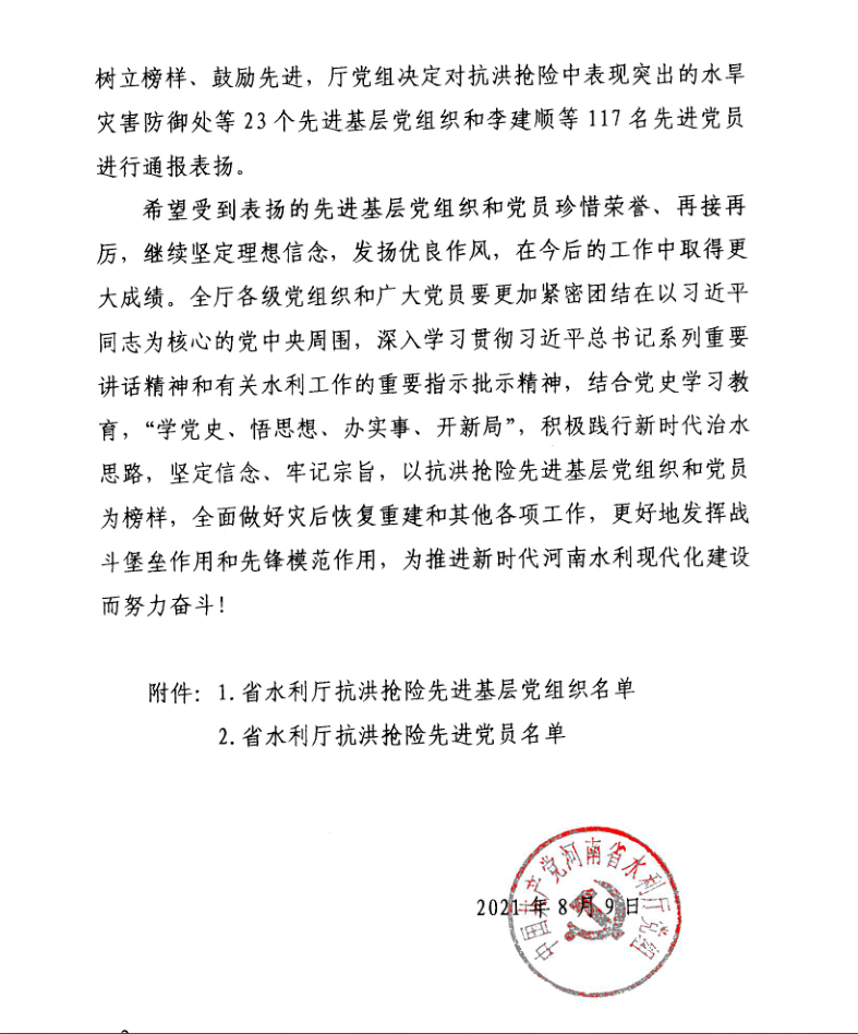 8月9日,省水利廳黨組以豫水組【2021】60號(hào)文下發(fā)了《關(guān)于對(duì)在抗洪搶險(xiǎn)中表現(xiàn)突出的先進(jìn)基層黨組織和黨員進(jìn)行表彰的決定》,公司黨委作為省水利廳抗洪搶險(xiǎn)先進(jìn)基層黨組織,翟淵軍、朱太山、趙廷華、楊華軍、王志軍、陳輝、張明恩、劉蘭勤等8名黨員同志作為省水利廳抗洪搶險(xiǎn)先進(jìn)黨員受到通報(bào)表?yè)P(yáng)。