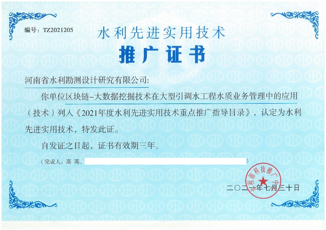 近日,豫水設(shè)計(jì)公司技術(shù)創(chuàng)新成果“區(qū)塊鏈——大數(shù)據(jù)挖掘技術(shù)在大型引調(diào)水工程水質(zhì)業(yè)務(wù)管理中的應(yīng)用”成功入選水利部《2021年水利先進(jìn)實(shí)用技術(shù)重點(diǎn)推廣指導(dǎo)目錄》,被認(rèn)定為水利先進(jìn)實(shí)用技術(shù)。