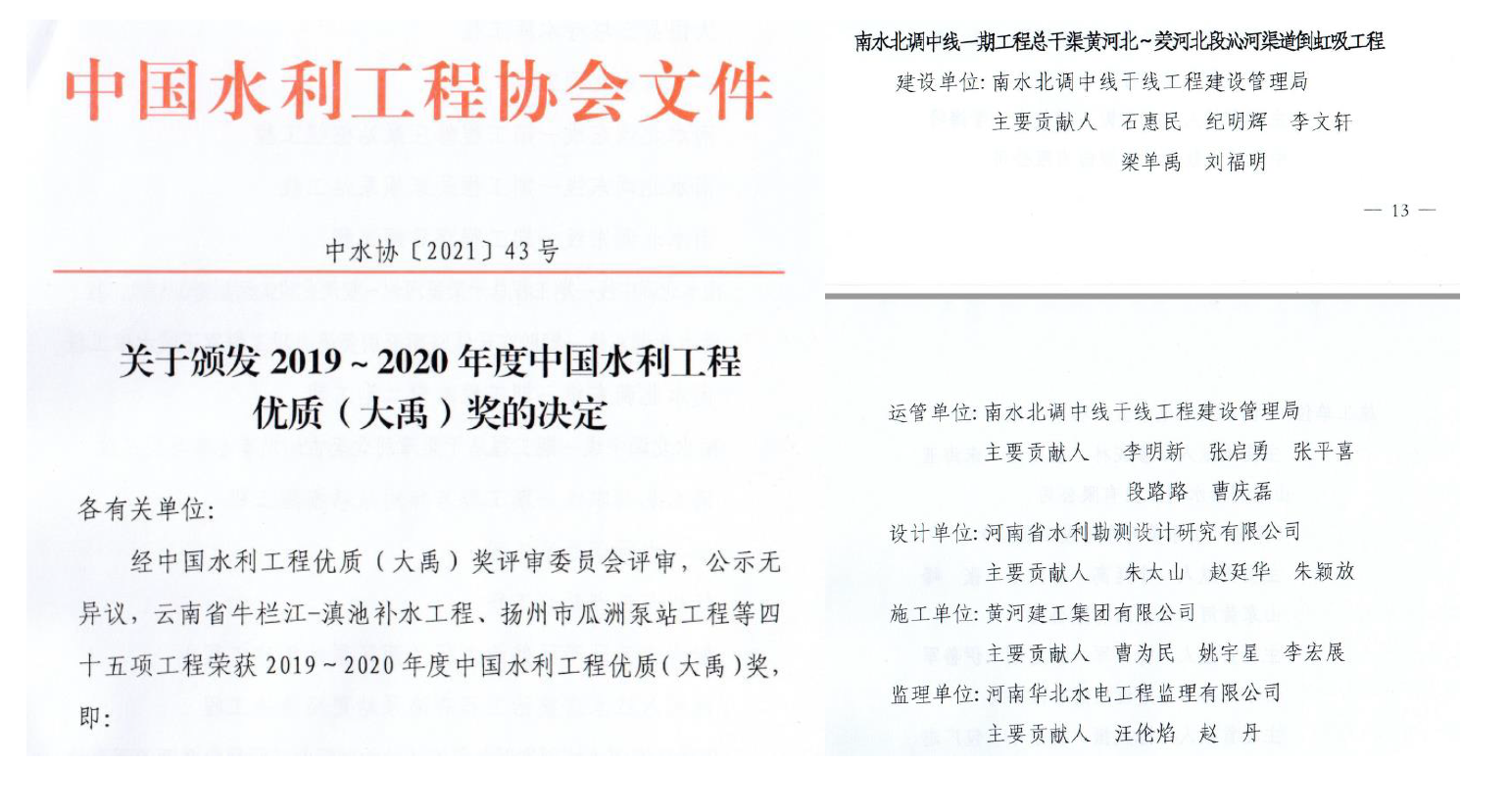 近日,中國水利工程優(yōu)質(zhì)(大禹)獎評選結果揭曉,由豫水設計公司擔綱設計的南水北調(diào)中線一期工程總干渠黃河北~羑河北段沁河渠道倒虹吸工程,憑借科學設計和精良施工,榮獲2019年~2020年度中國水利工程優(yōu)質(zhì)(大禹)獎。