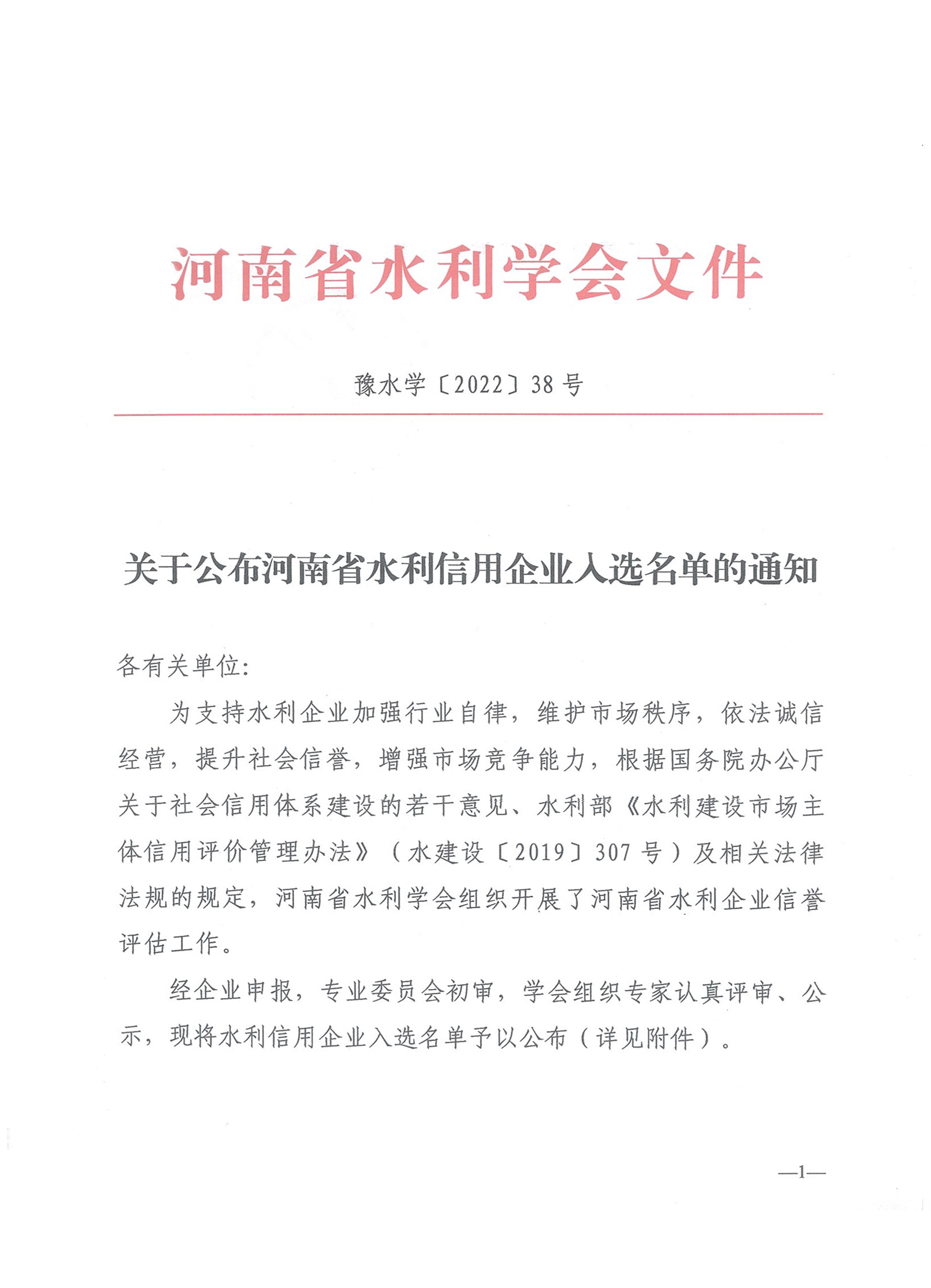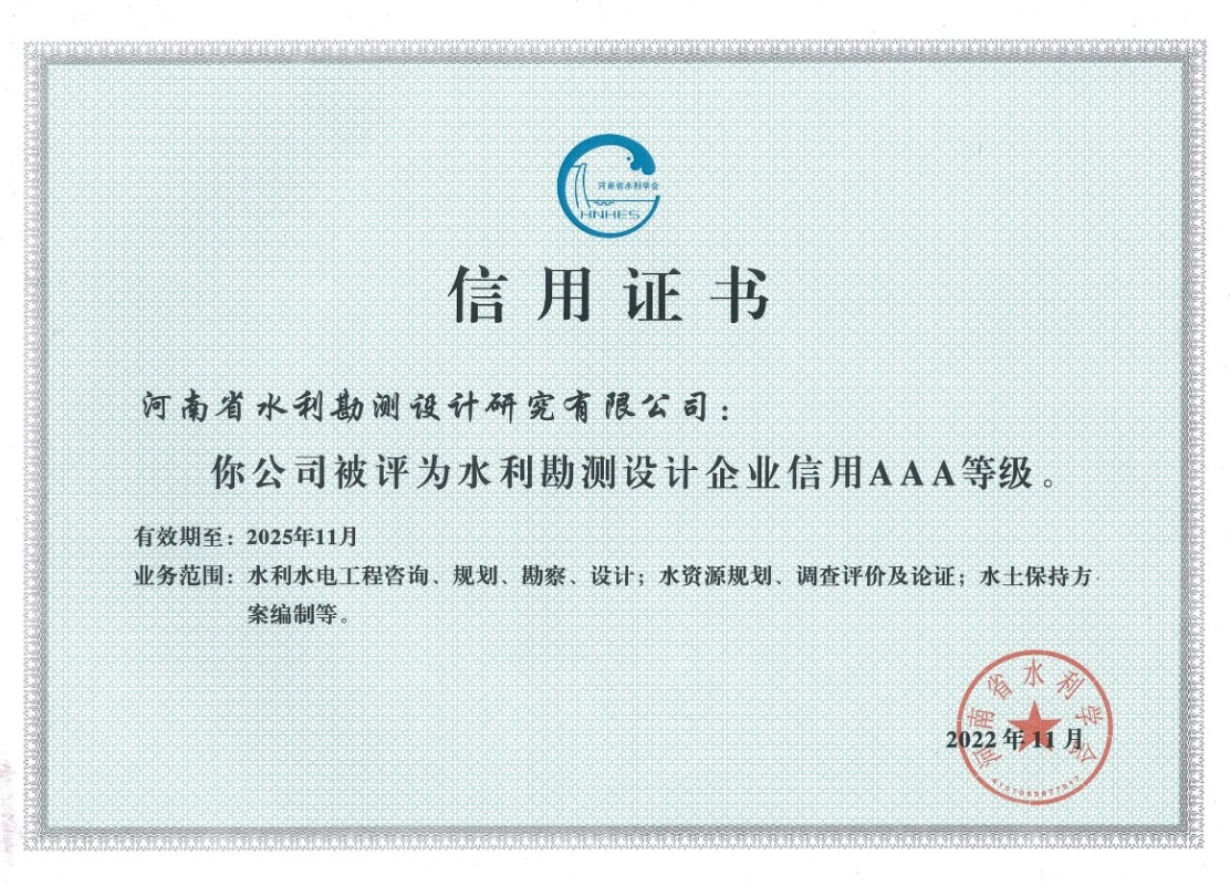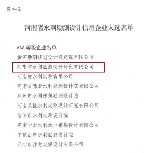 近日,河南省水利學會發(fā)布河南省水利信用企業(yè)入選名單,豫水設計公司被評為“水利勘測設計企業(yè)信用AAA等級”。