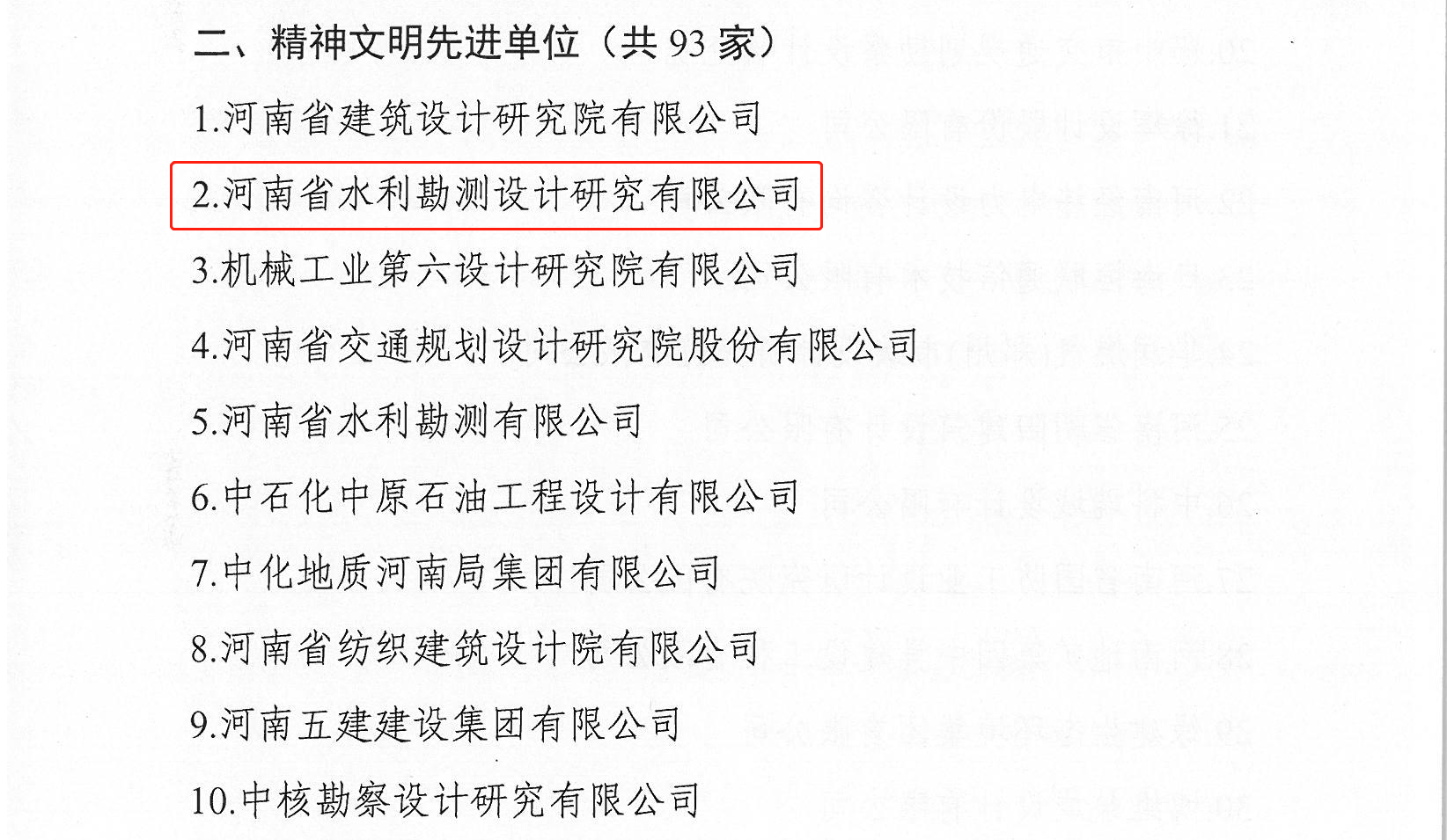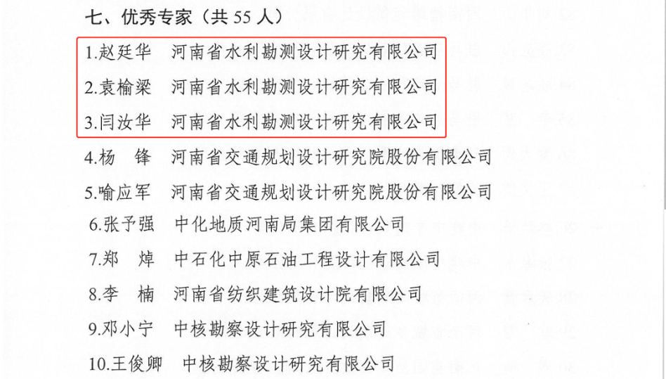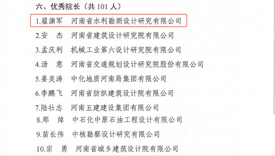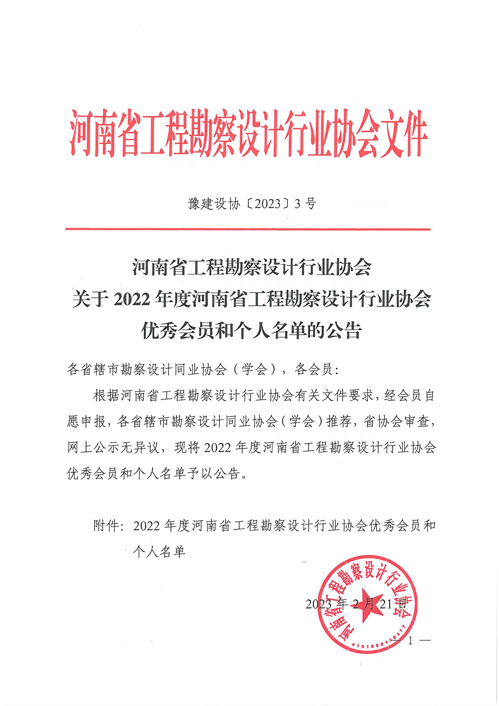 2月21日,由河南省工程勘察設(shè)計行業(yè)協(xié)會組織的“2022年度河南省工程勘察設(shè)計行業(yè)協(xié)會優(yōu)秀會員和個人名單”評選活動公布結(jié)果,我公司榮獲“優(yōu)秀勘察設(shè)計咨詢企業(yè)”、“精神文明先進單位”、“轉(zhuǎn)型發(fā)展標(biāo)桿企業(yè)”三項榮譽稱號。公司董事長翟淵軍被授予“優(yōu)秀院長”,公司副總經(jīng)理趙廷華、副總經(jīng)理袁榆梁、監(jiān)事會主席閆汝華3名同志被授予“優(yōu)秀專家”。