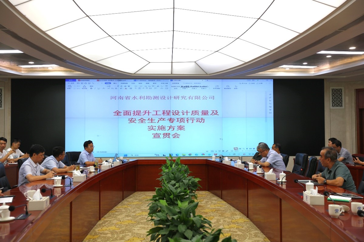 為貫徹落實(shí)《河南水利投資集團(tuán)有限公司全面提升工程建設(shè)管理水平專項(xiàng)行動(dòng)實(shí)施方案》(豫水投〔2023〕151 號)精神,結(jié)合《水利部辦公廳關(guān)于印發(fā)2023年度水利工程建設(shè)質(zhì)量提升工作方案的通知》(辦建設(shè)〔2023〕94號)、水利部《水利建設(shè)項(xiàng)目稽察工作指導(dǎo)手冊》(2023年版)和省委省政府、省水利廳有關(guān)部署要求,全面提升工程設(shè)計(jì)質(zhì)量和安全生產(chǎn)管理,2023年7月25日下午,公司在二樓會(huì)商中心特舉辦“全面提升工程設(shè)計(jì)質(zhì)量及安全生產(chǎn)專項(xiàng)行動(dòng)實(shí)施方案”宣貫會(huì),會(huì)議由總經(jīng)理朱太山主持,技術(shù)總監(jiān)楊華軍進(jìn)行宣貫。公司副總經(jīng)理賈少燕、趙廷華、監(jiān)事會(huì)主席閆汝華、公司技術(shù)副總監(jiān)、各生產(chǎn)部門班子成員及各項(xiàng)目設(shè)總共100余人參會(huì)。
