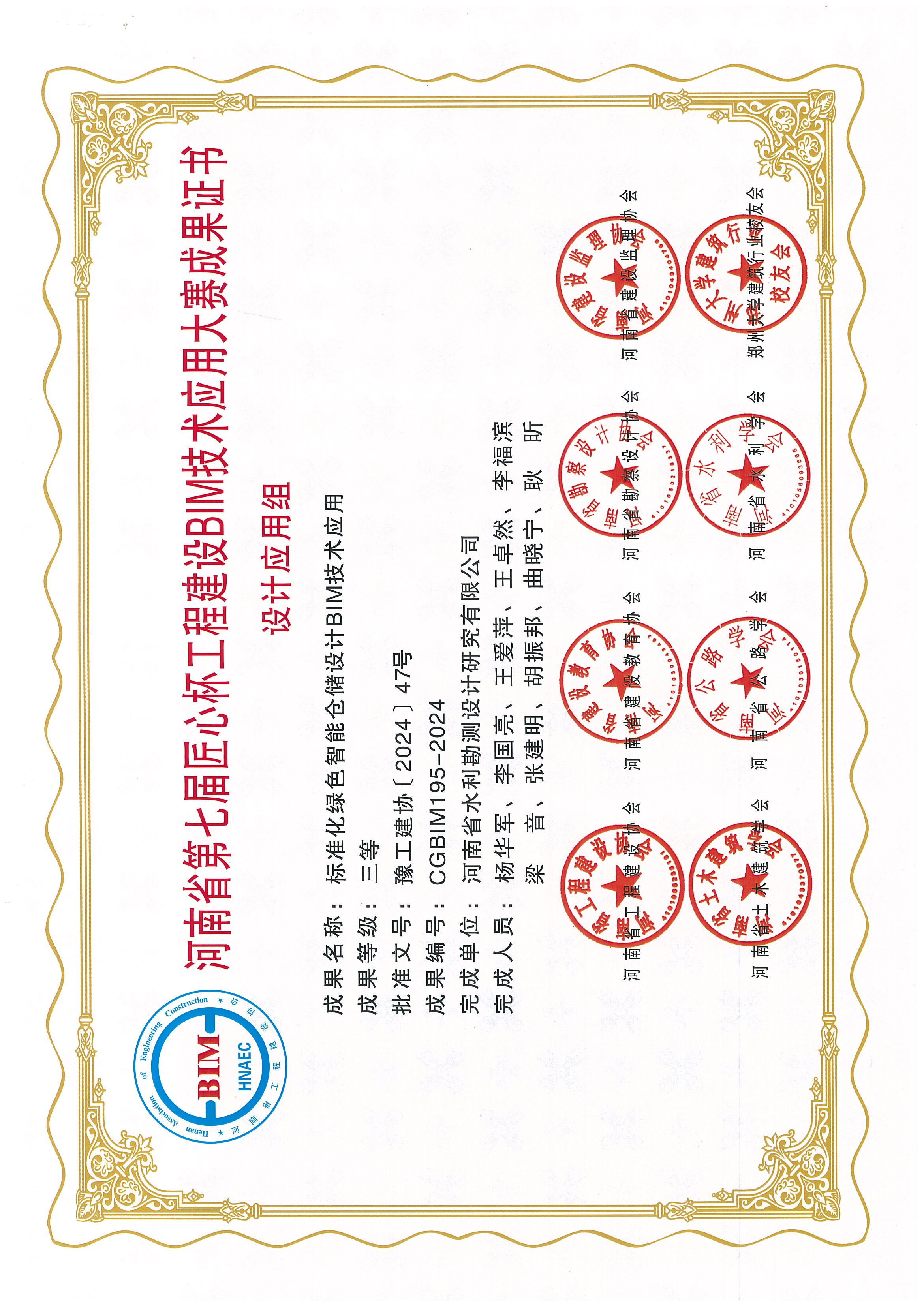 3.《河南省蟒河口水庫左岸防滲工程中的BIM應用》《BIM+和GIS在南水北調(diào)中線工程水土保持設計中的應用》《標準化綠色智能倉儲設計BIM技術應用》獲得三等獎。