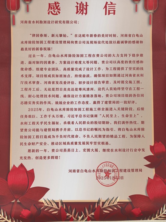 2月14日上午,河南省白龜山水庫(kù)除險(xiǎn)加固工程建設(shè)管理局趙東城局長(zhǎng)一行到訪(fǎng)公司,送來(lái)“精心設(shè)計(jì)鑄精品,團(tuán)隊(duì)協(xié)作展風(fēng)采”的錦旗和感謝信,以感謝公司在白龜山水庫(kù)除險(xiǎn)加固工程前期審批及建設(shè)期間的傾力付出。