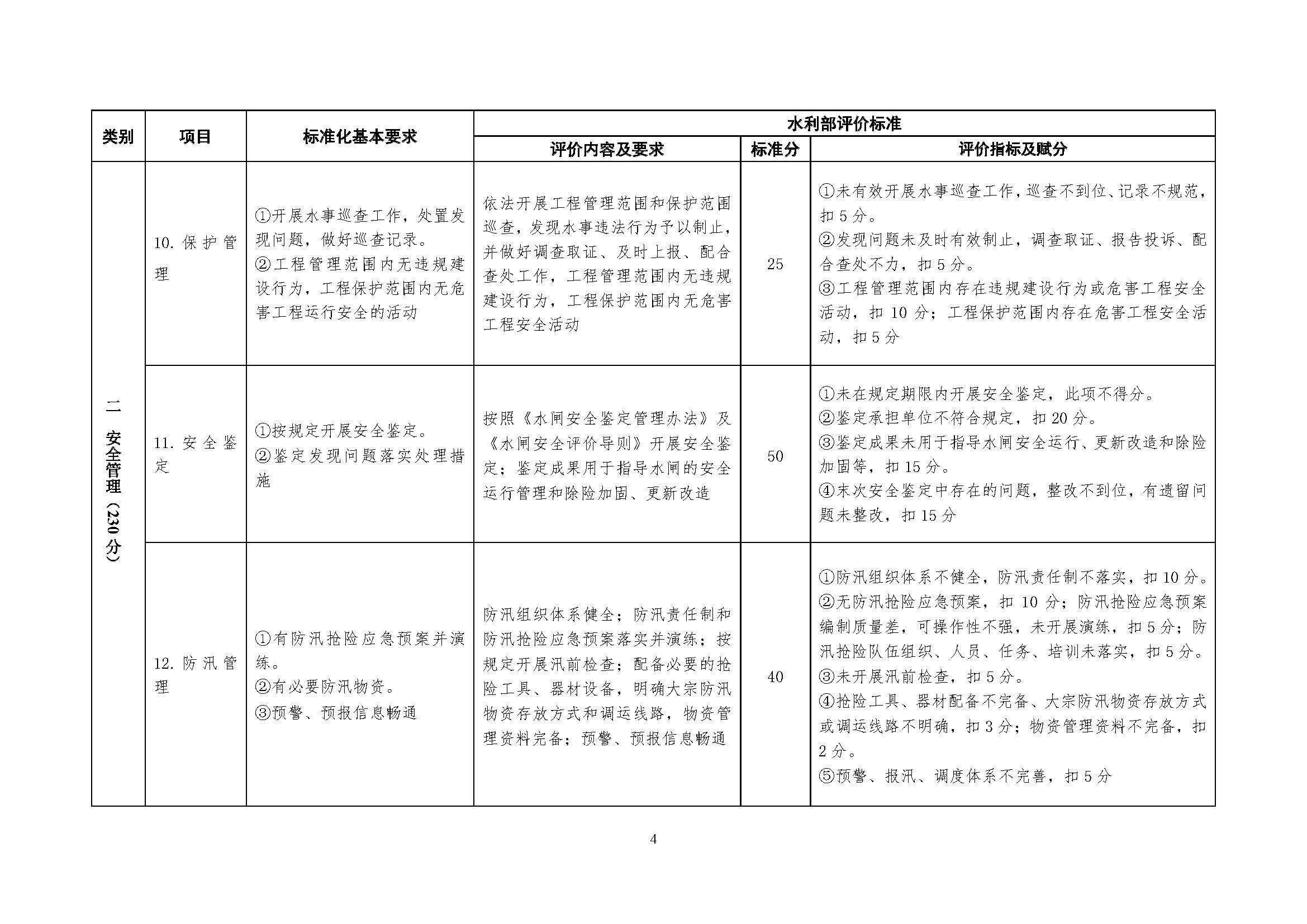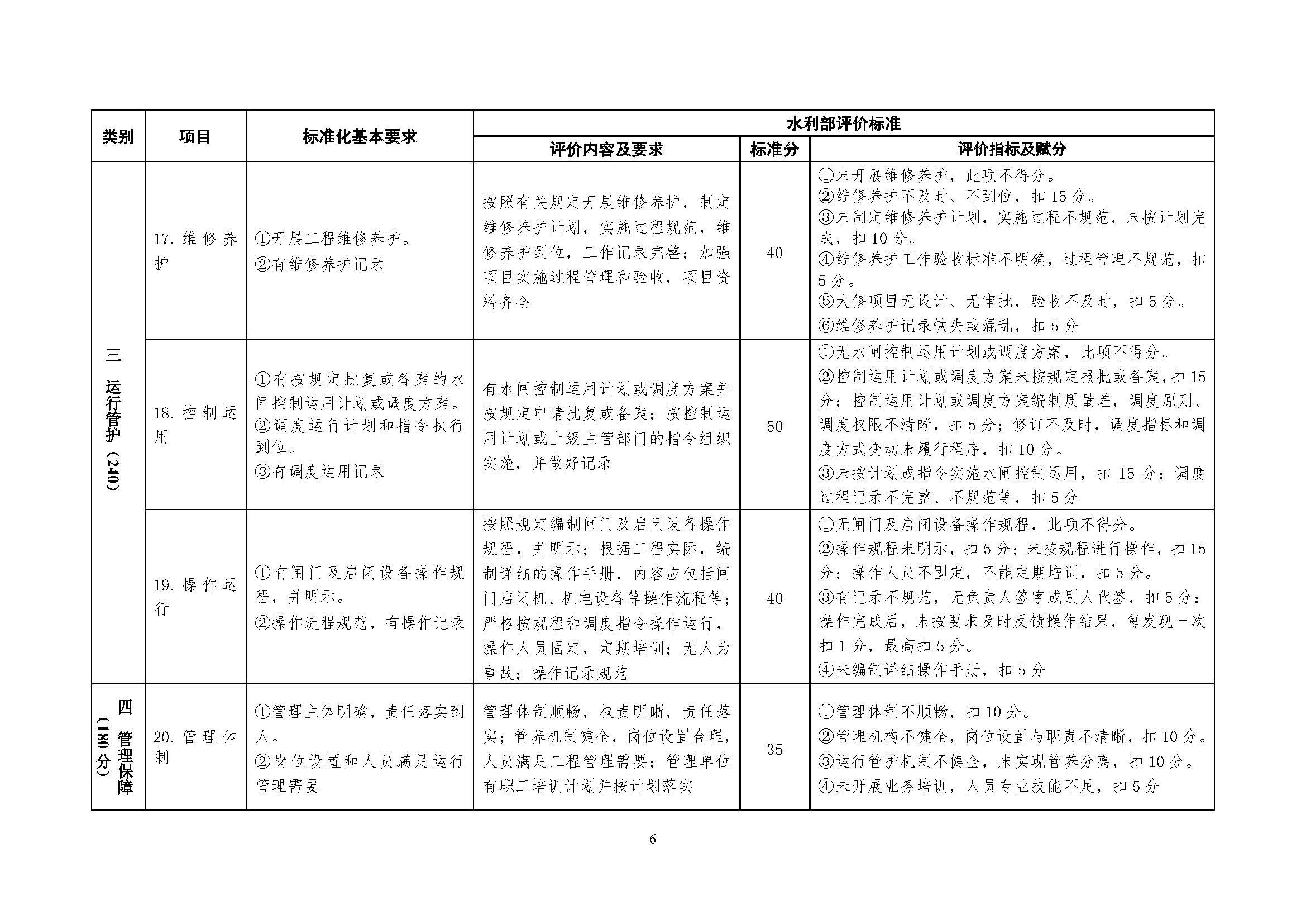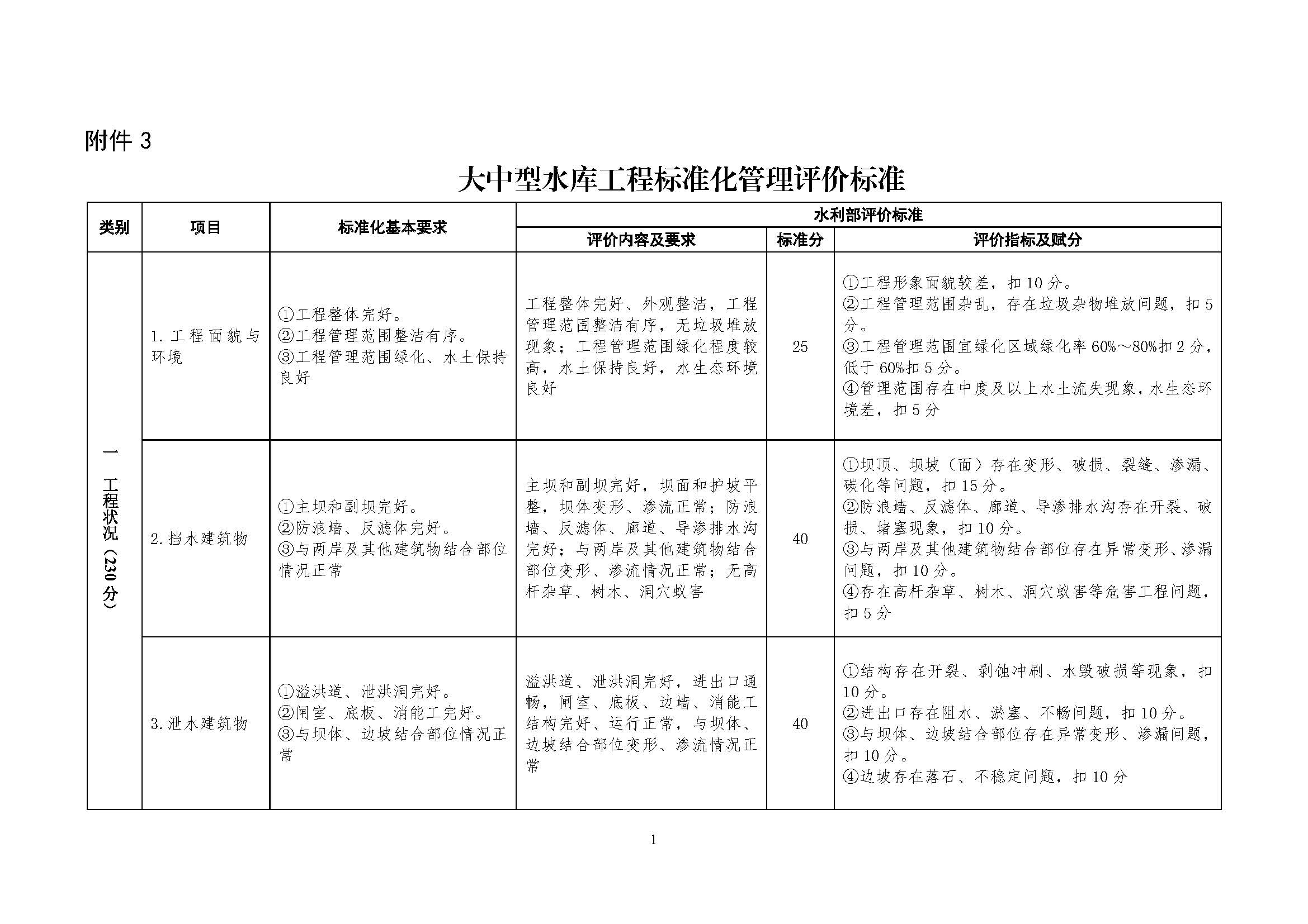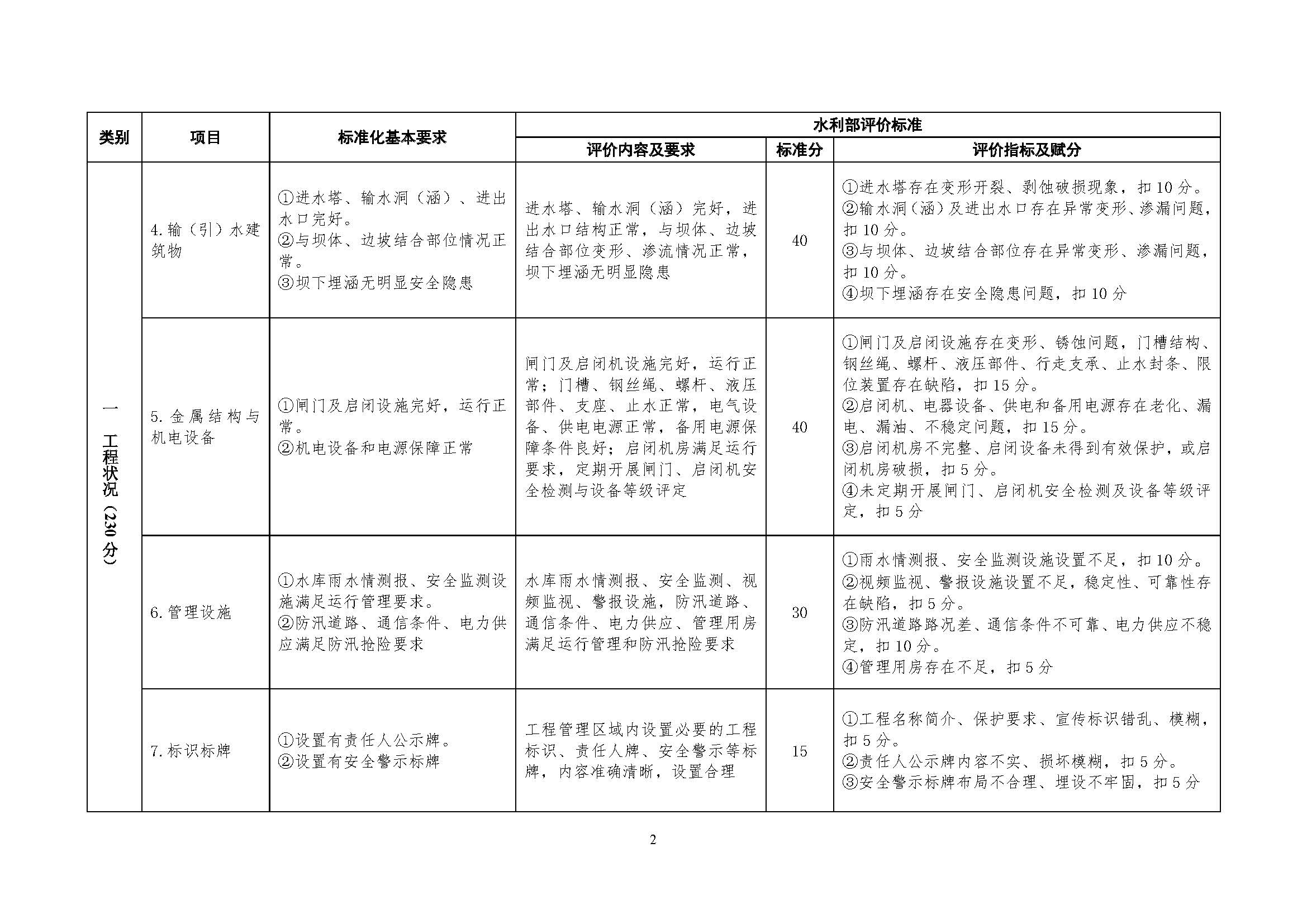 與《指導(dǎo)意見》相配套,同時印發(fā)了《評價辦法》及其評價標(biāo)準(zhǔn),對標(biāo)準(zhǔn)化評價的適用范圍、評價主體、評價程序等作出規(guī)定,包括大中型水庫、大中型水閘、3級以上堤防評價標(biāo)準(zhǔn)。