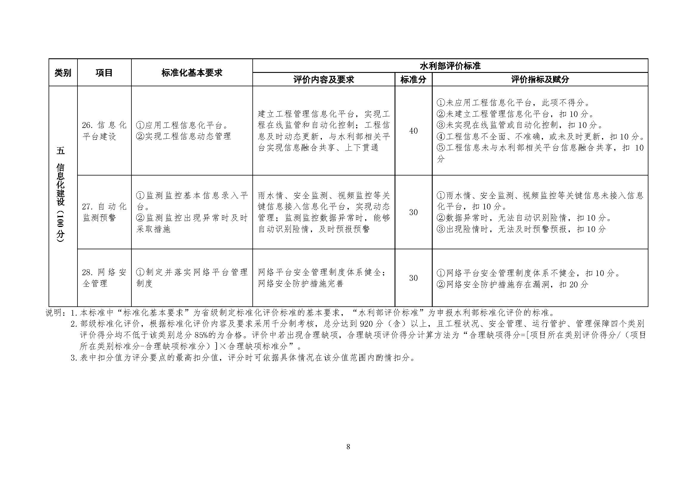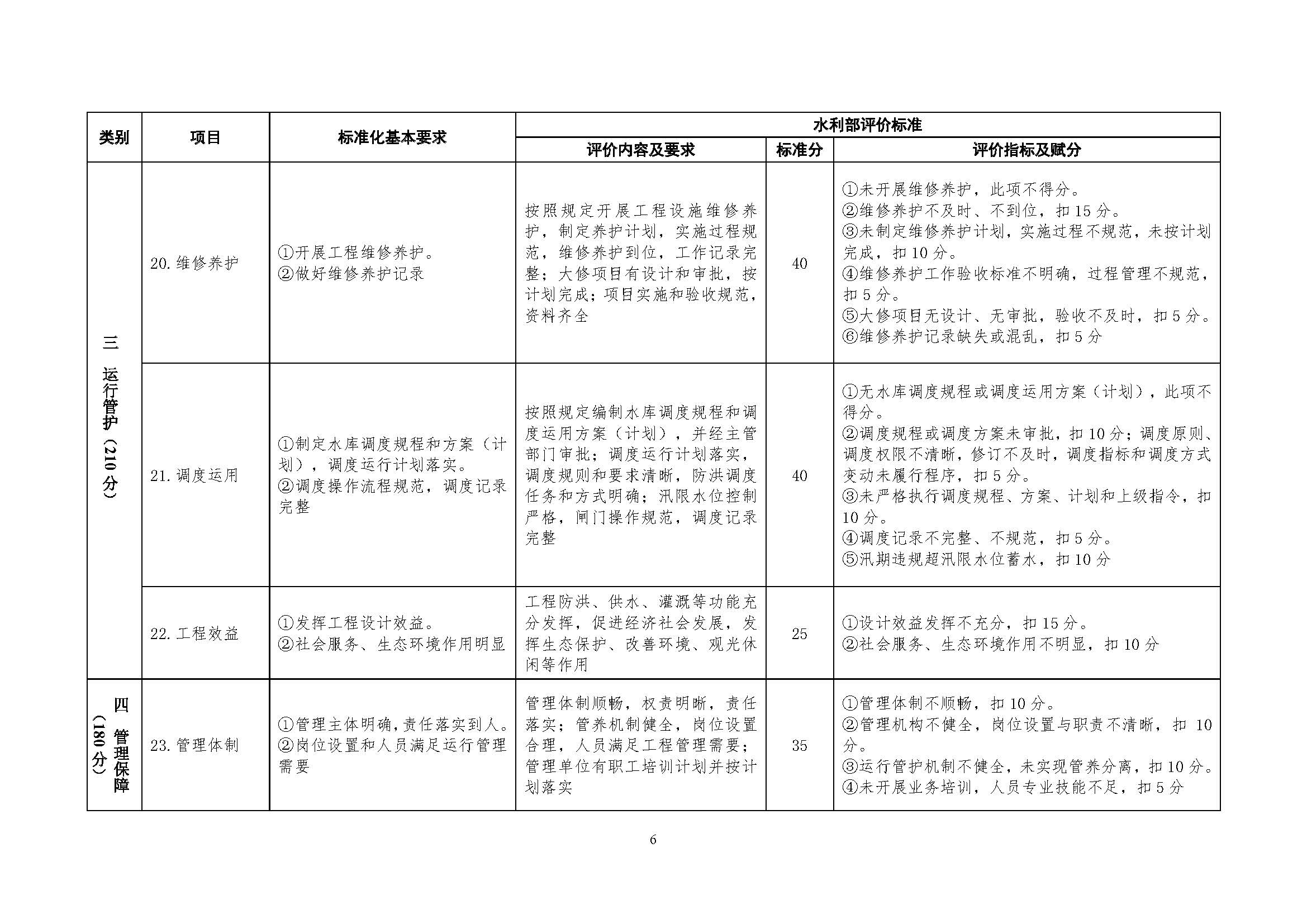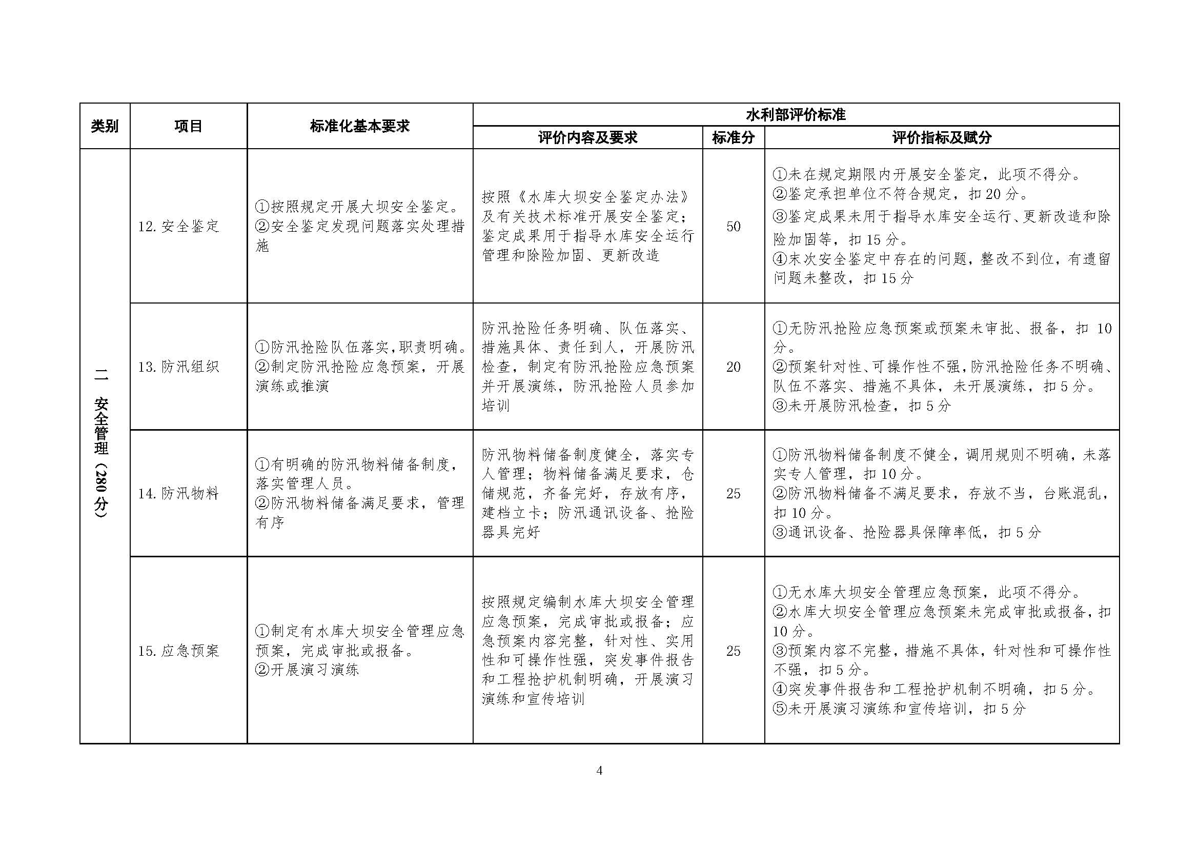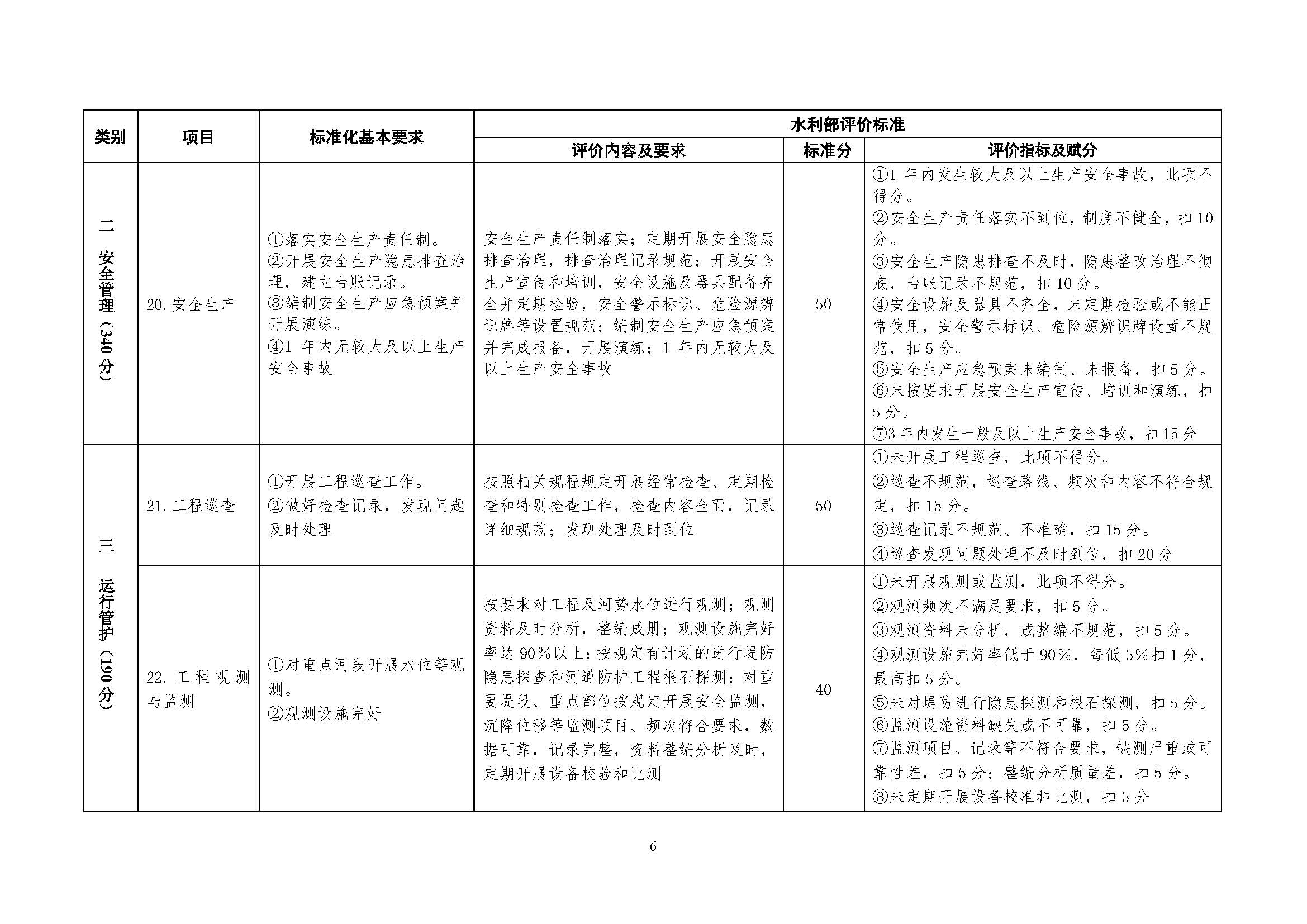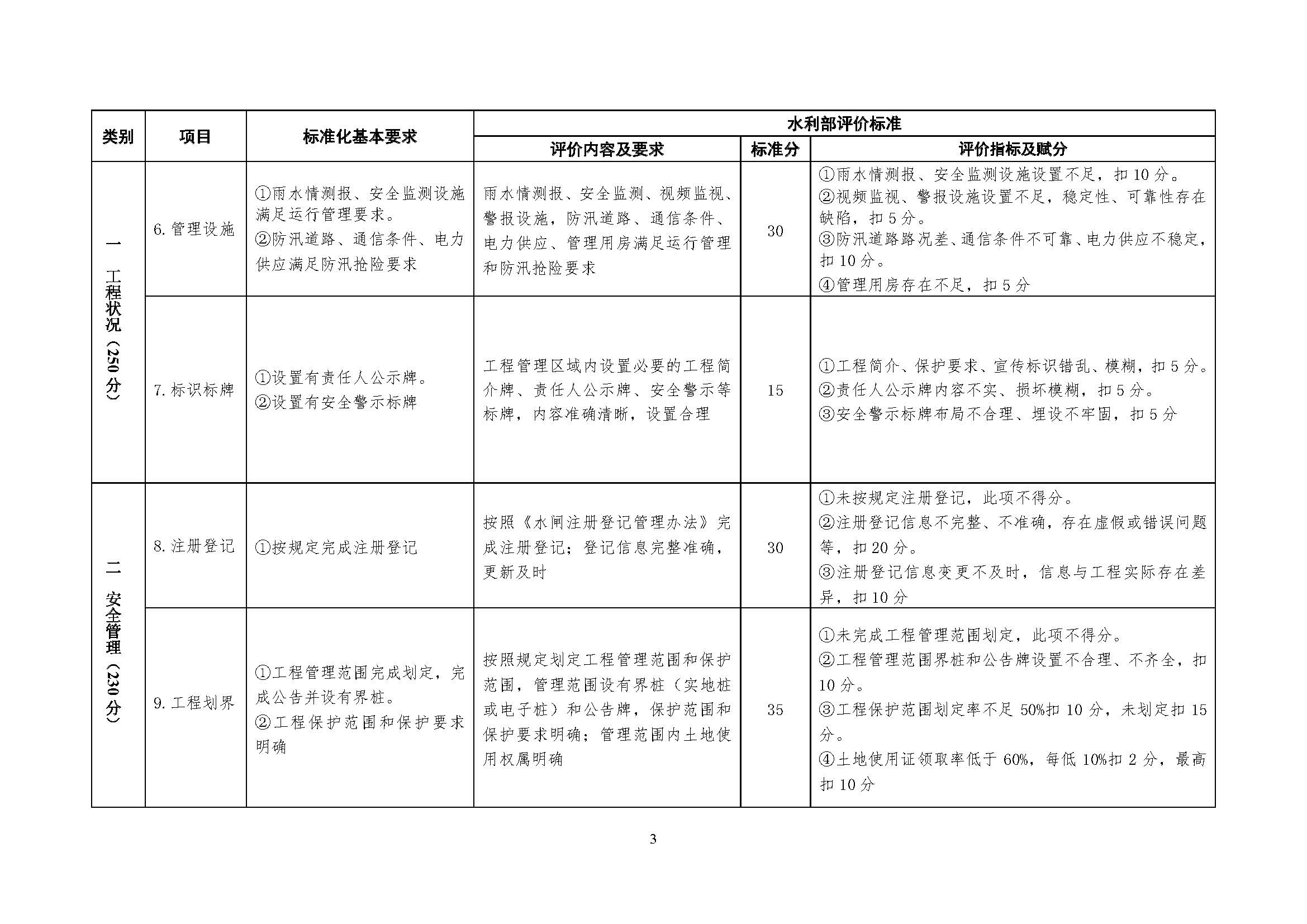 與《指導(dǎo)意見》相配套,同時印發(fā)了《評價辦法》及其評價標(biāo)準(zhǔn),對標(biāo)準(zhǔn)化評價的適用范圍、評價主體、評價程序等作出規(guī)定,包括大中型水庫、大中型水閘、3級以上堤防評價標(biāo)準(zhǔn)。