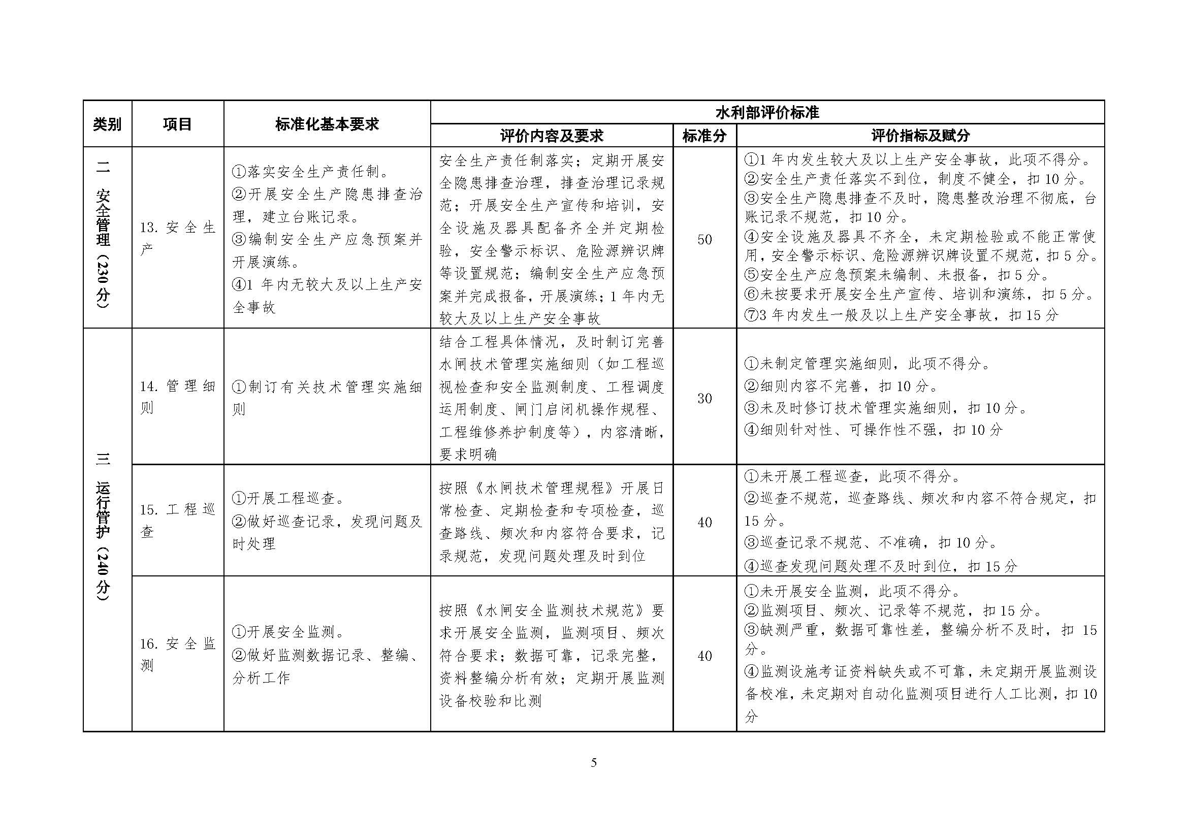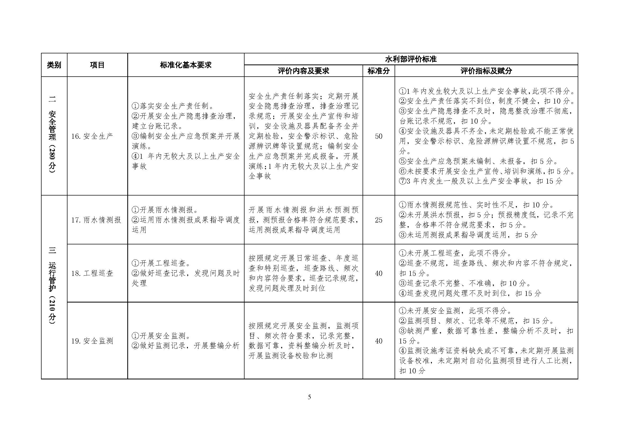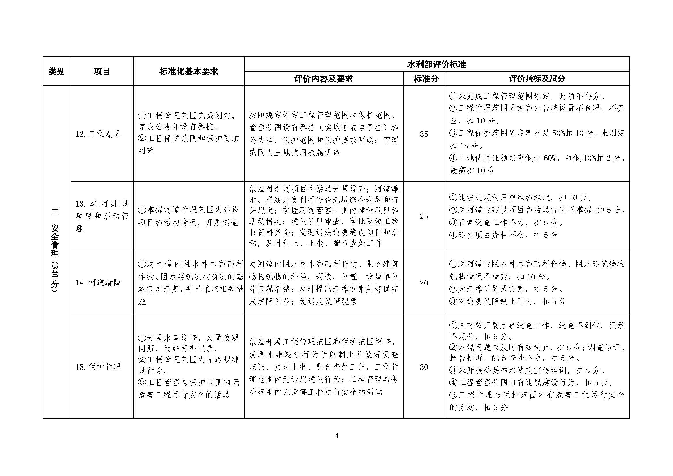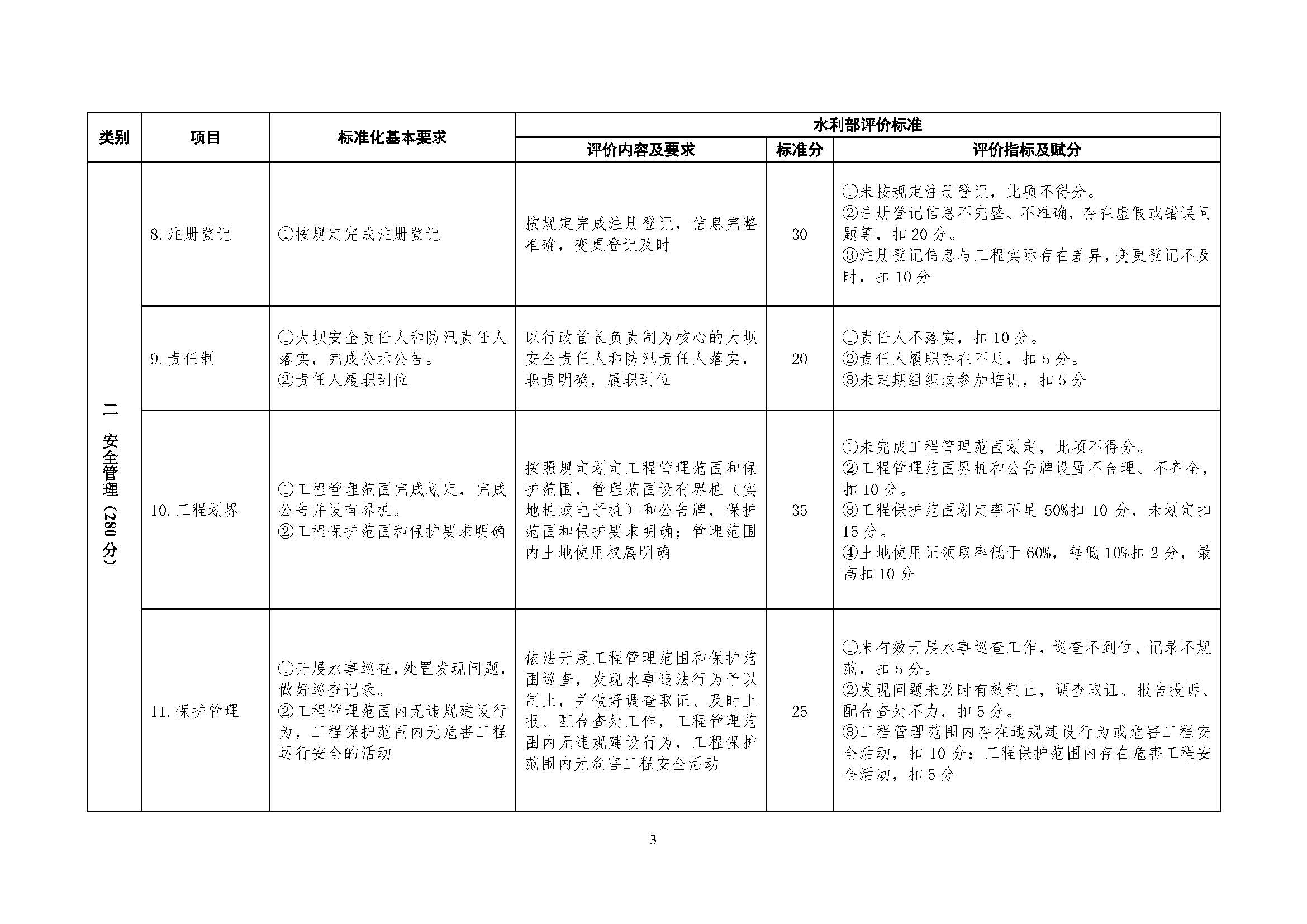 與《指導(dǎo)意見》相配套,同時印發(fā)了《評價辦法》及其評價標(biāo)準(zhǔn),對標(biāo)準(zhǔn)化評價的適用范圍、評價主體、評價程序等作出規(guī)定,包括大中型水庫、大中型水閘、3級以上堤防評價標(biāo)準(zhǔn)。