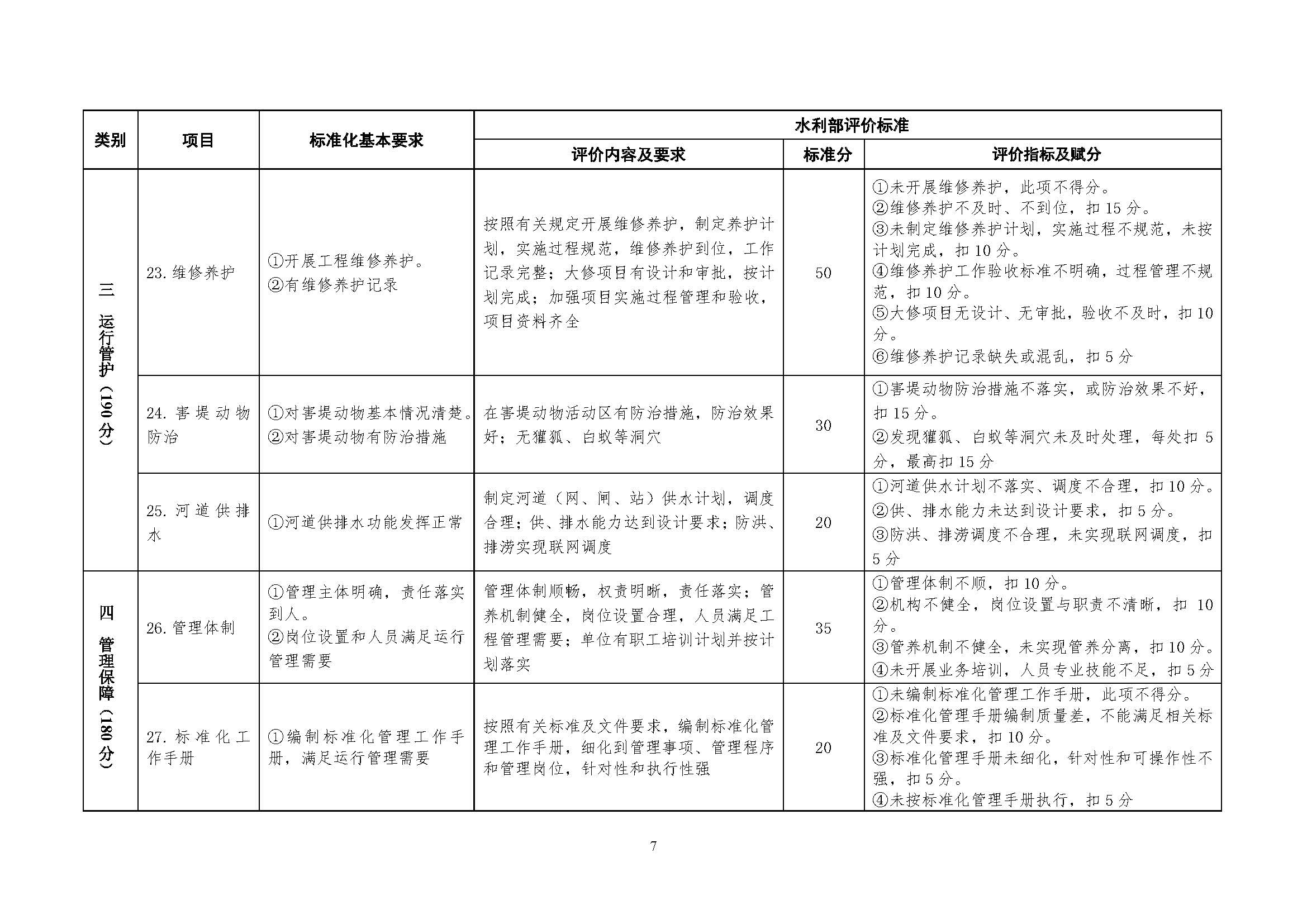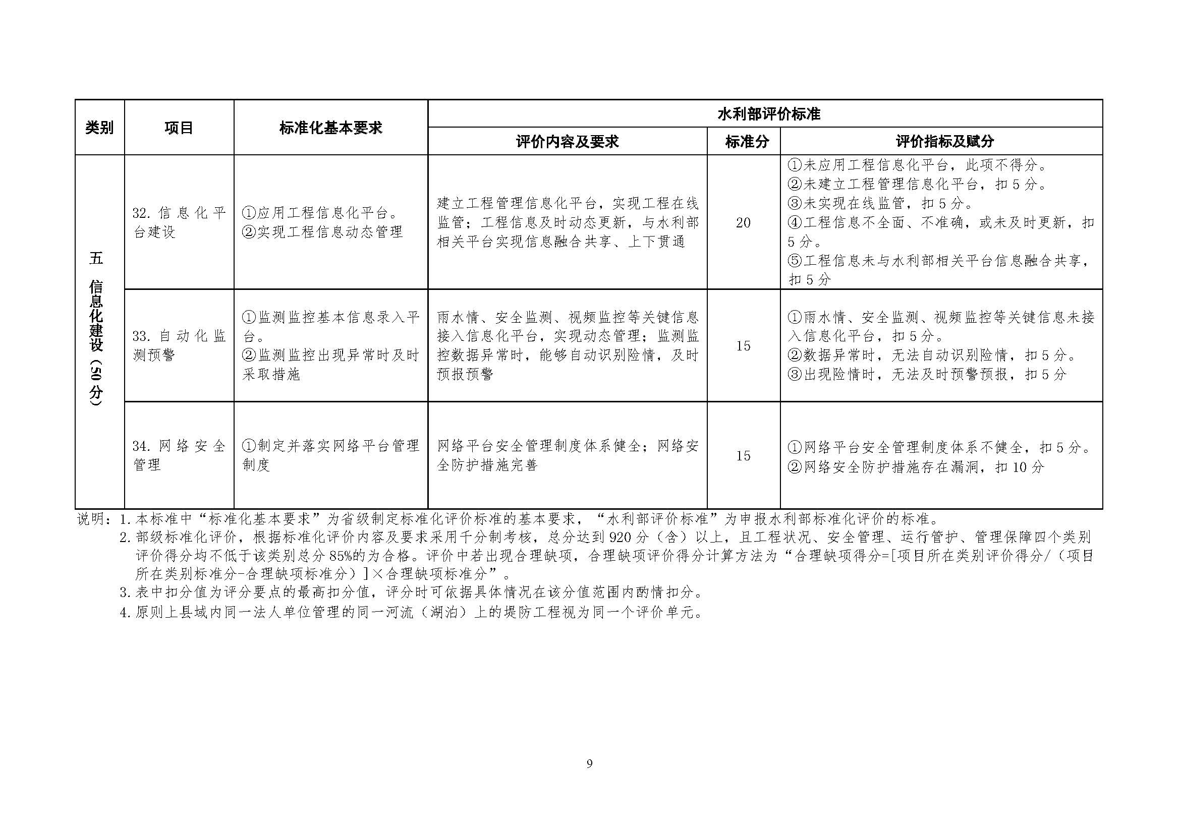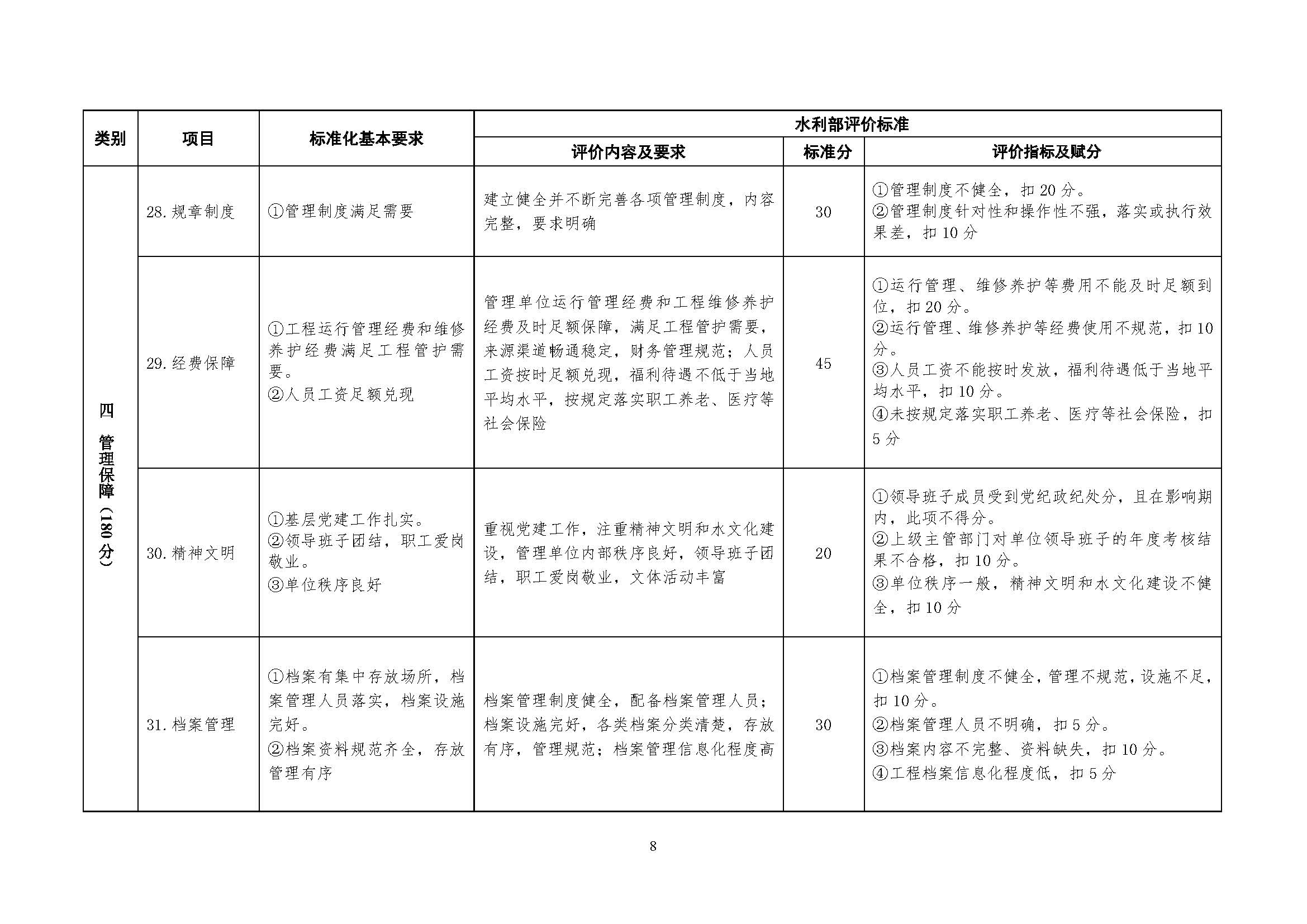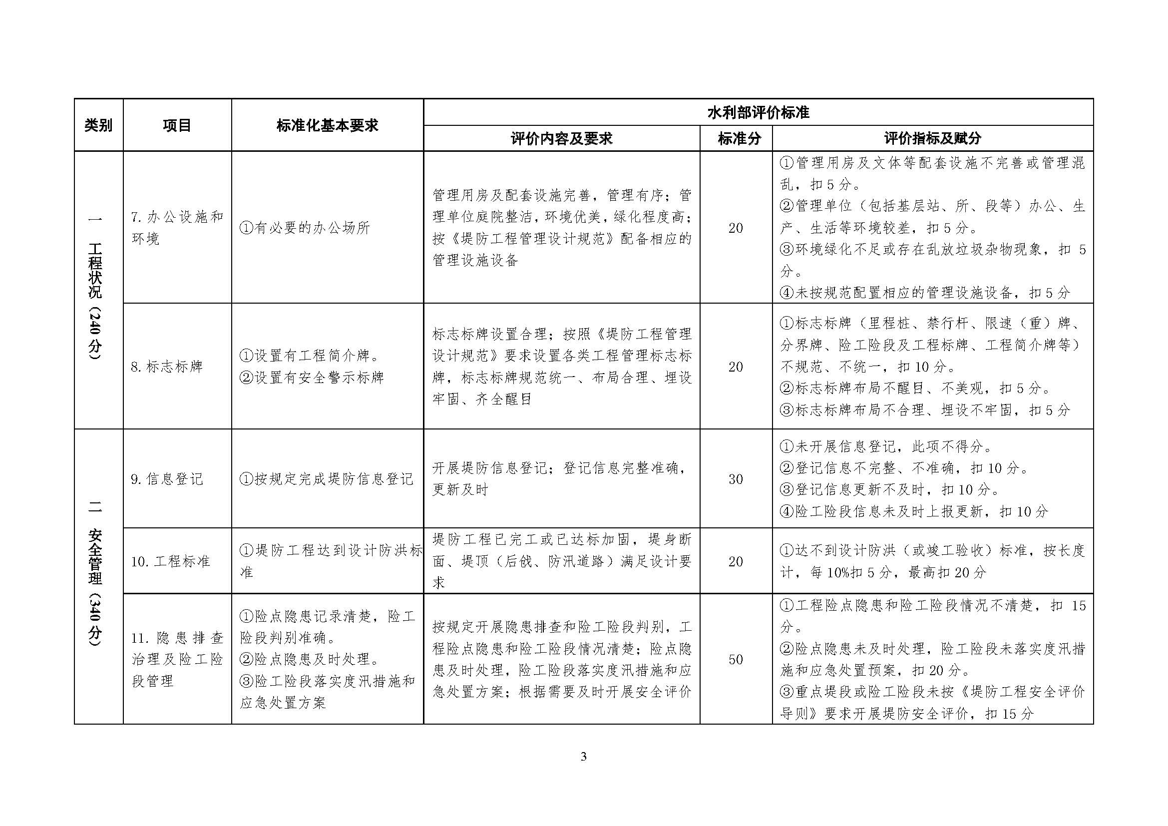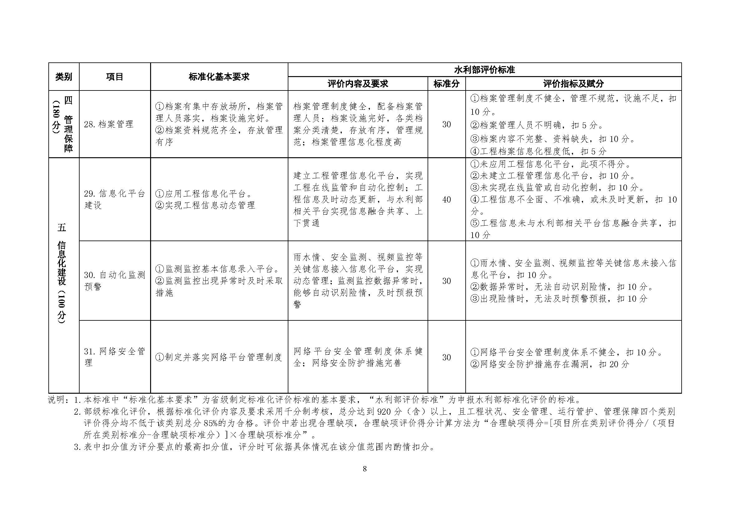 與《指導(dǎo)意見》相配套,同時印發(fā)了《評價辦法》及其評價標(biāo)準(zhǔn),對標(biāo)準(zhǔn)化評價的適用范圍、評價主體、評價程序等作出規(guī)定,包括大中型水庫、大中型水閘、3級以上堤防評價標(biāo)準(zhǔn)。