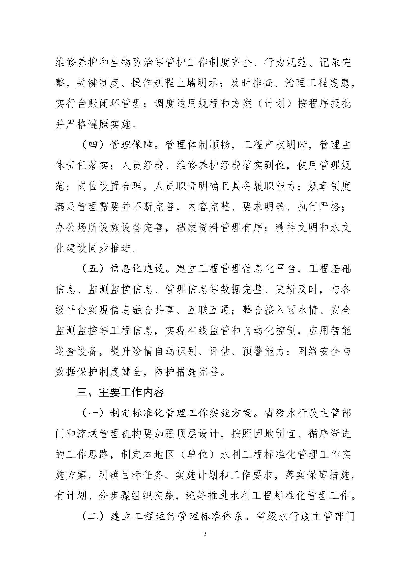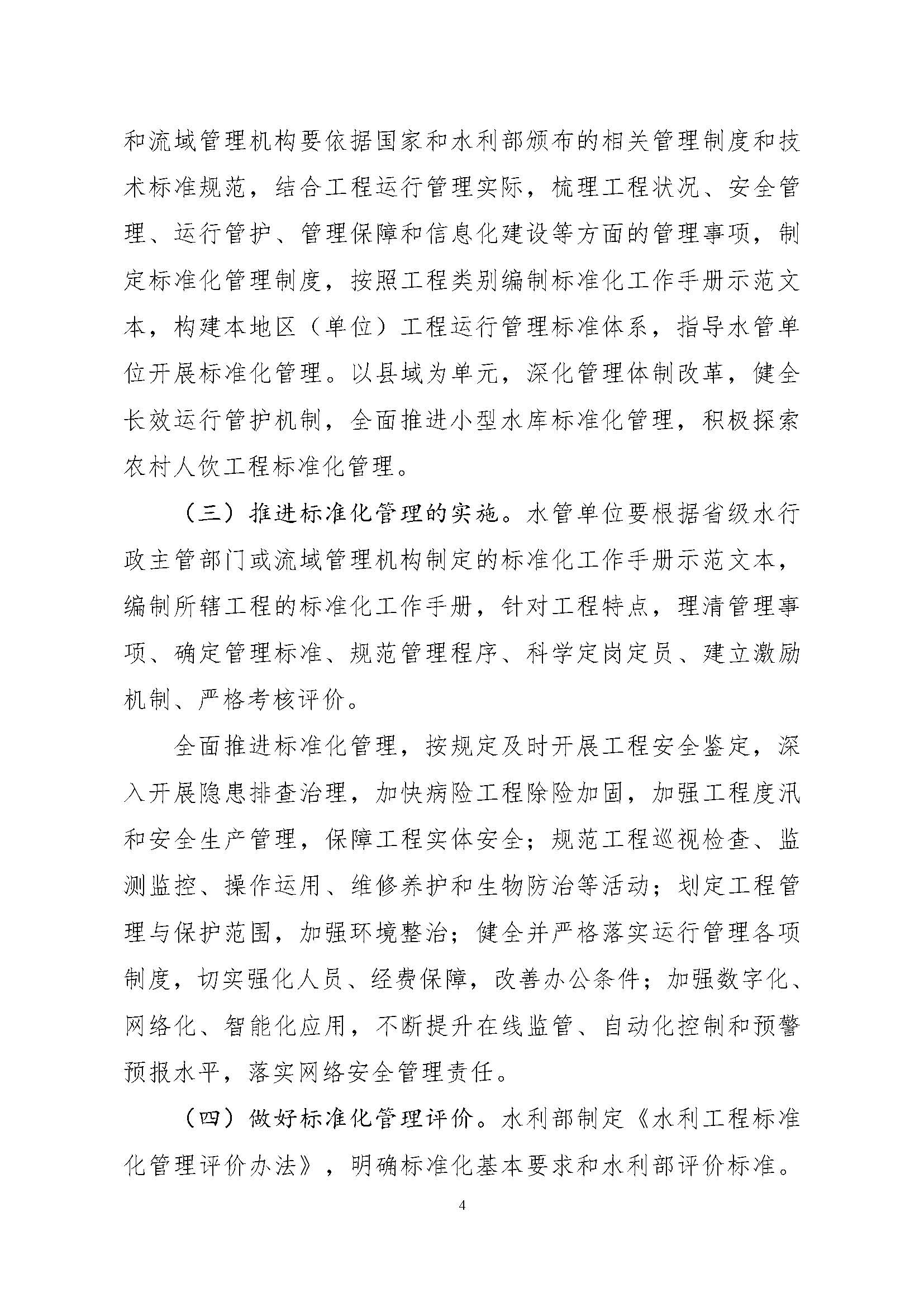 《指導(dǎo)意見》強(qiáng)調(diào),要落實(shí)管理責(zé)任,規(guī)范管理行為,提高管理能力,在工程狀況、安全管理、運(yùn)行管護(hù)、管理保障和信息化建設(shè)等5個方面滿足標(biāo)準(zhǔn)化管理要求?!吨笇?dǎo)意見》還確定了制定實(shí)施方案、建立運(yùn)行管理標(biāo)準(zhǔn)體系、推進(jìn)標(biāo)準(zhǔn)化管理的實(shí)施、做好標(biāo)準(zhǔn)化管理評價等工作步驟和具體內(nèi)容,提出了保障措施。