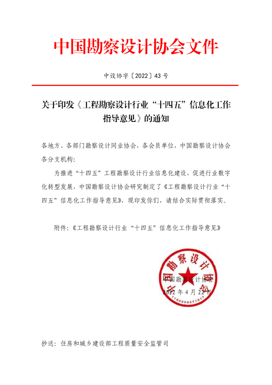 為推進(jìn)“十四五”工程勘察設(shè)計(jì)行業(yè)信息化建設(shè),促進(jìn)行業(yè)數(shù)字化轉(zhuǎn)型發(fā)展,中國勘察設(shè)計(jì)協(xié)會(huì)研究制定了《工程勘察設(shè)計(jì)行業(yè)“十四五”信息化工作指導(dǎo)意見》,并印發(fā)通知予以發(fā)布。