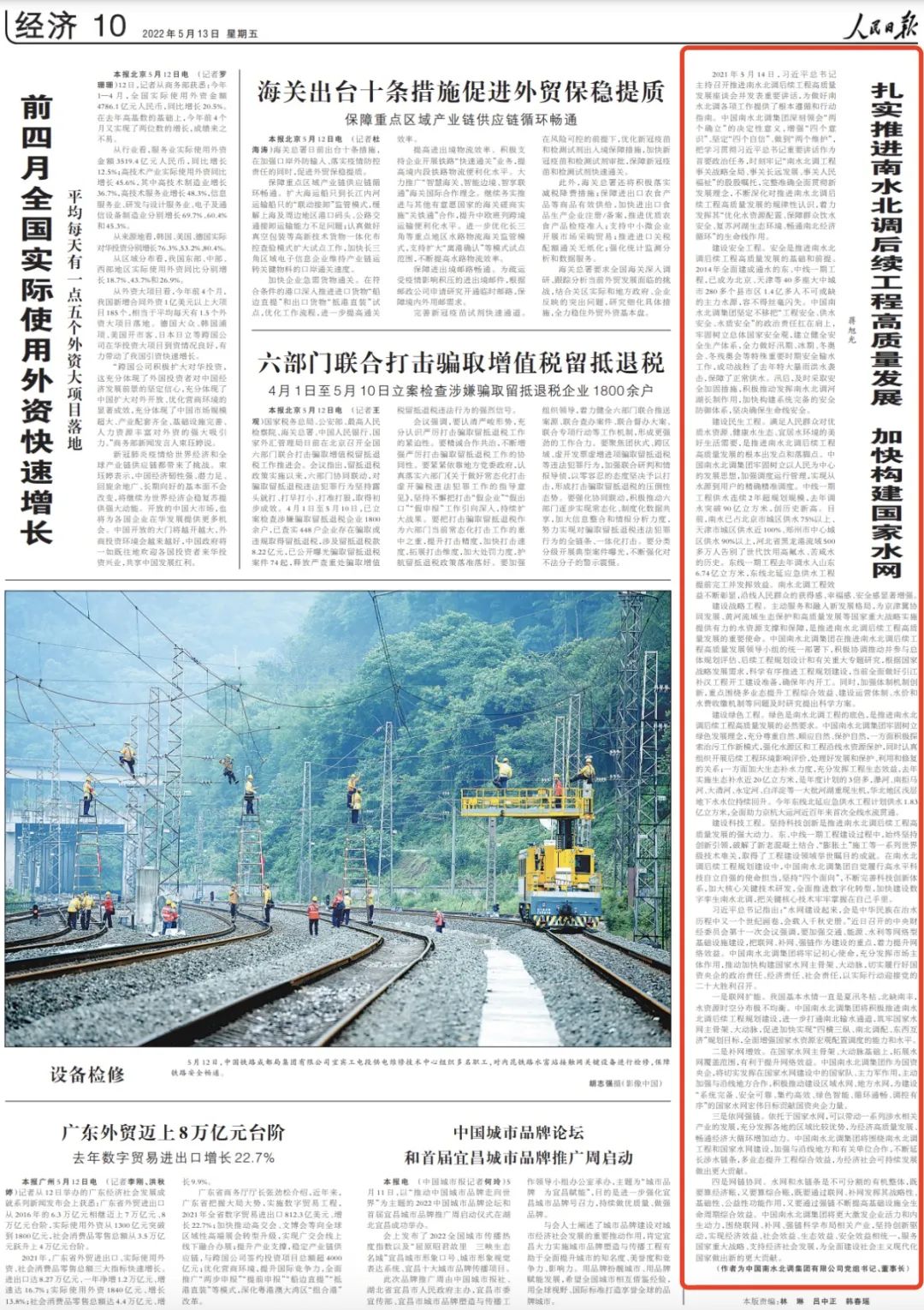 5月13日,在習(xí)近平總書記發(fā)表“5·14”重要講話一周年之際,《人民日報(bào)》刊發(fā)中國南水北調(diào)集團(tuán)有限公司黨組書記、董事長蔣旭光署名文章《扎實(shí)推進(jìn)南水北調(diào)后續(xù)工程高質(zhì)量發(fā)展 加快構(gòu)建國家水網(wǎng)》。