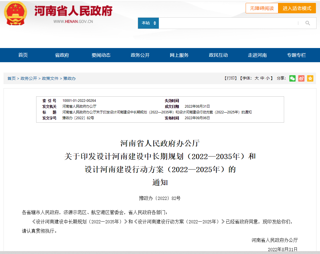 為認(rèn)真落實(shí)河南省第十一次黨代會(huì)精神,加快打造設(shè)計(jì)河南,為經(jīng)濟(jì)社會(huì)高質(zhì)量發(fā)展提供重要支撐,9月7日,河南省人民政府辦公廳發(fā)布《設(shè)計(jì)河南建設(shè)中長期規(guī)劃(2022—2035年)》和《設(shè)計(jì)河南建設(shè)行動(dòng)方案(2022—2025年)》。