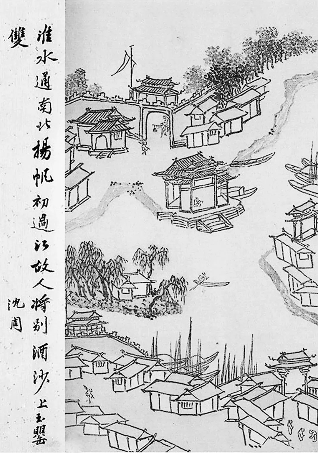 圖為明代畫家沈周的《兩江名勝圖冊》,題款:淮水通南北,揚(yáng)帆初過江。故人將別酒,沙上玉罌雙。